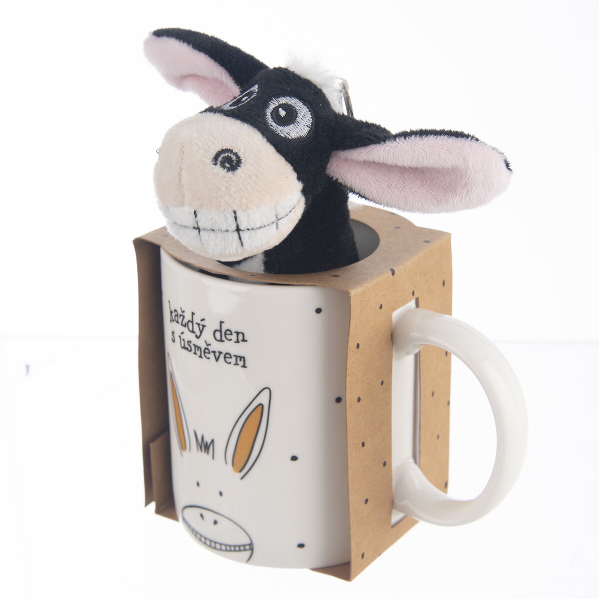 Více informacíBílý porcelánový hrneček zbobí hezký potisk s hlavou oslíka a nápis "každý den s úsměvem". Z takového hrnečku se bude dobře pít, má objem 390 ml a šikovné ouško, za které se dobře drží. Navíc v něj je vložen vtipný oslík, takže se hrneček může stát i roztomilým dárkem pro vaše blízké a přátele.