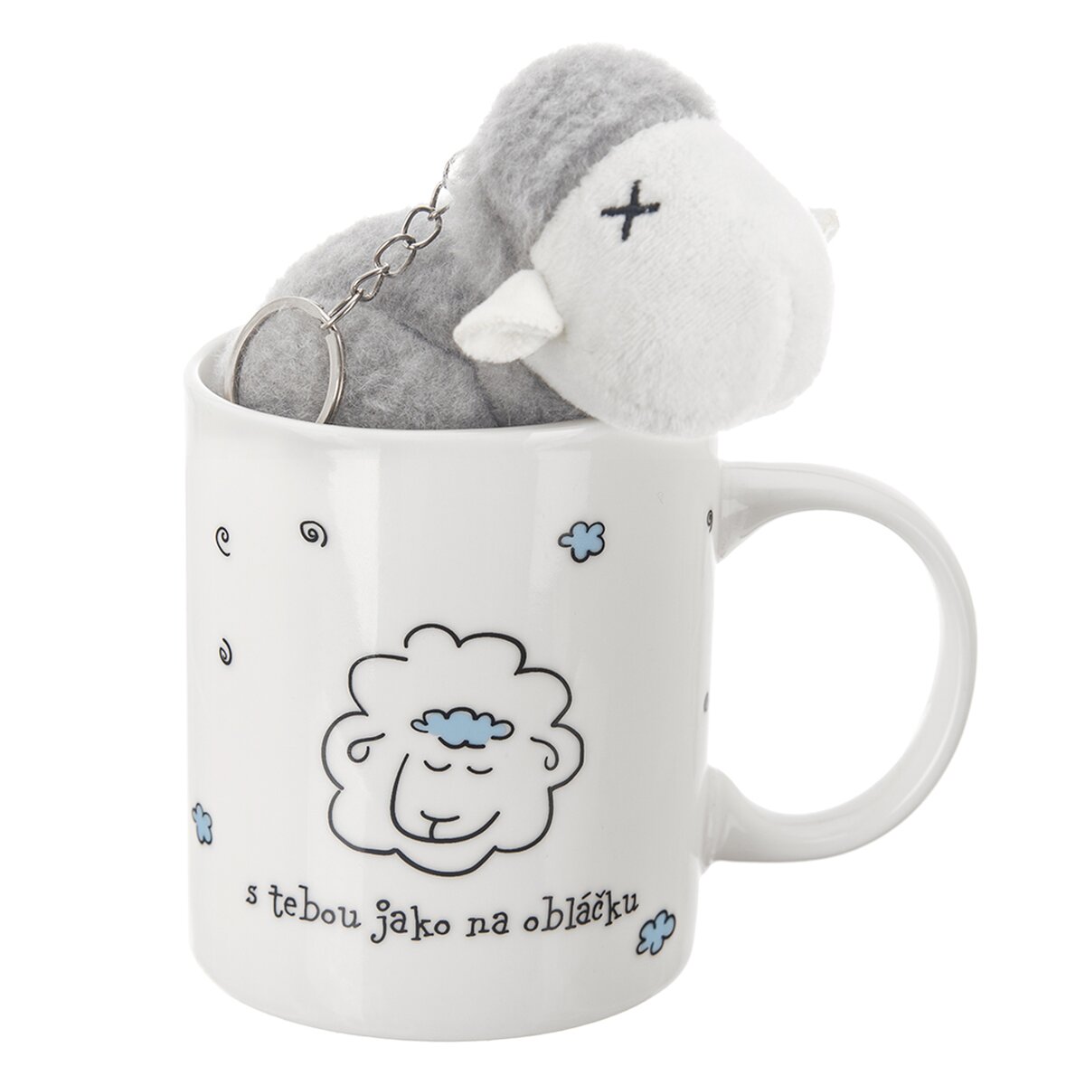 Kód produktu 129624Rovný porcelánový hrnek s nápisem "s tebou jako na obláčku" a motivem ovečky je doplněn doplněn plyšovým přívěskem, vhodným k zavěšení. Milý dárek pro radost.