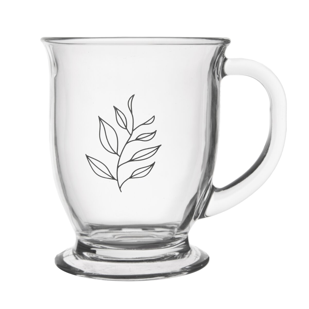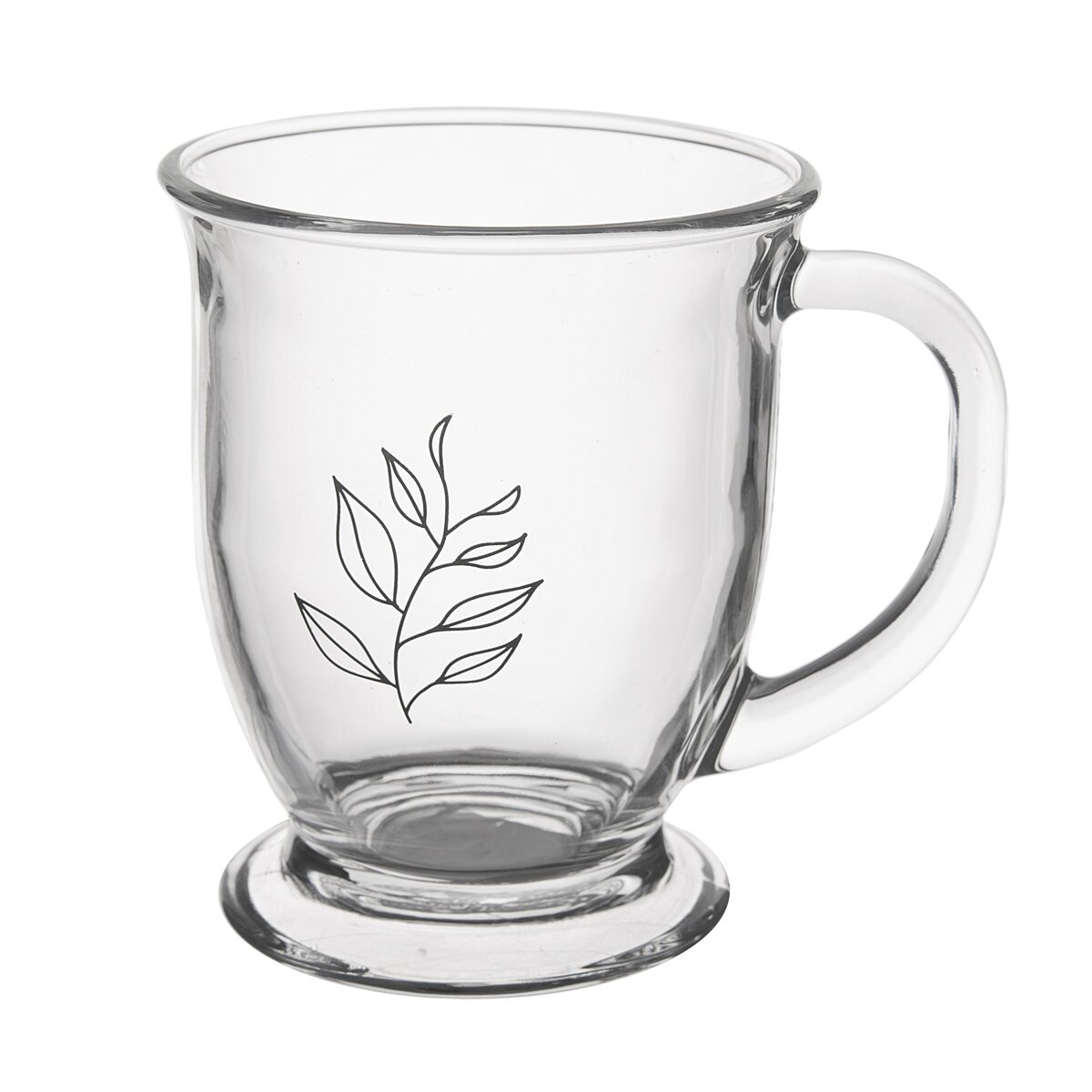Kód produktu 128859Skleněný hrnek s uchem o objemu 450 ml je zdoben dekorem čajových lístků.