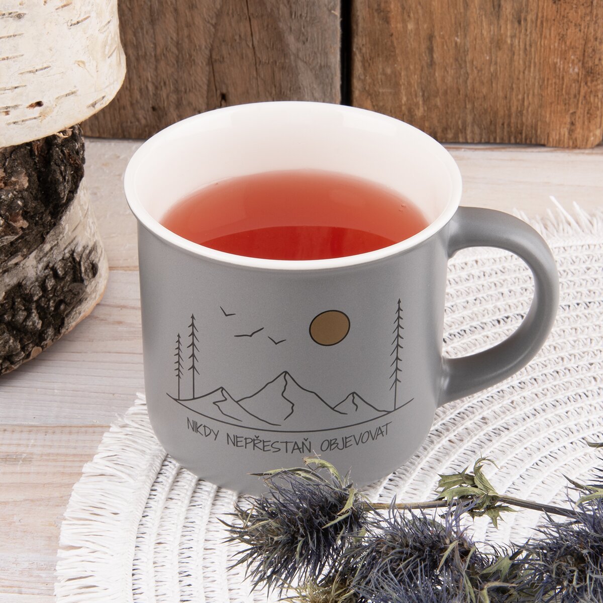 Kód produktu 132202Porcelánový šedý hrnek CESTOVÁNÍ má objem 0,4 l a hodí se k podávání čaje, kávy s mlékem, melty, kakaa i k přípravě polévky "do hrnečku".