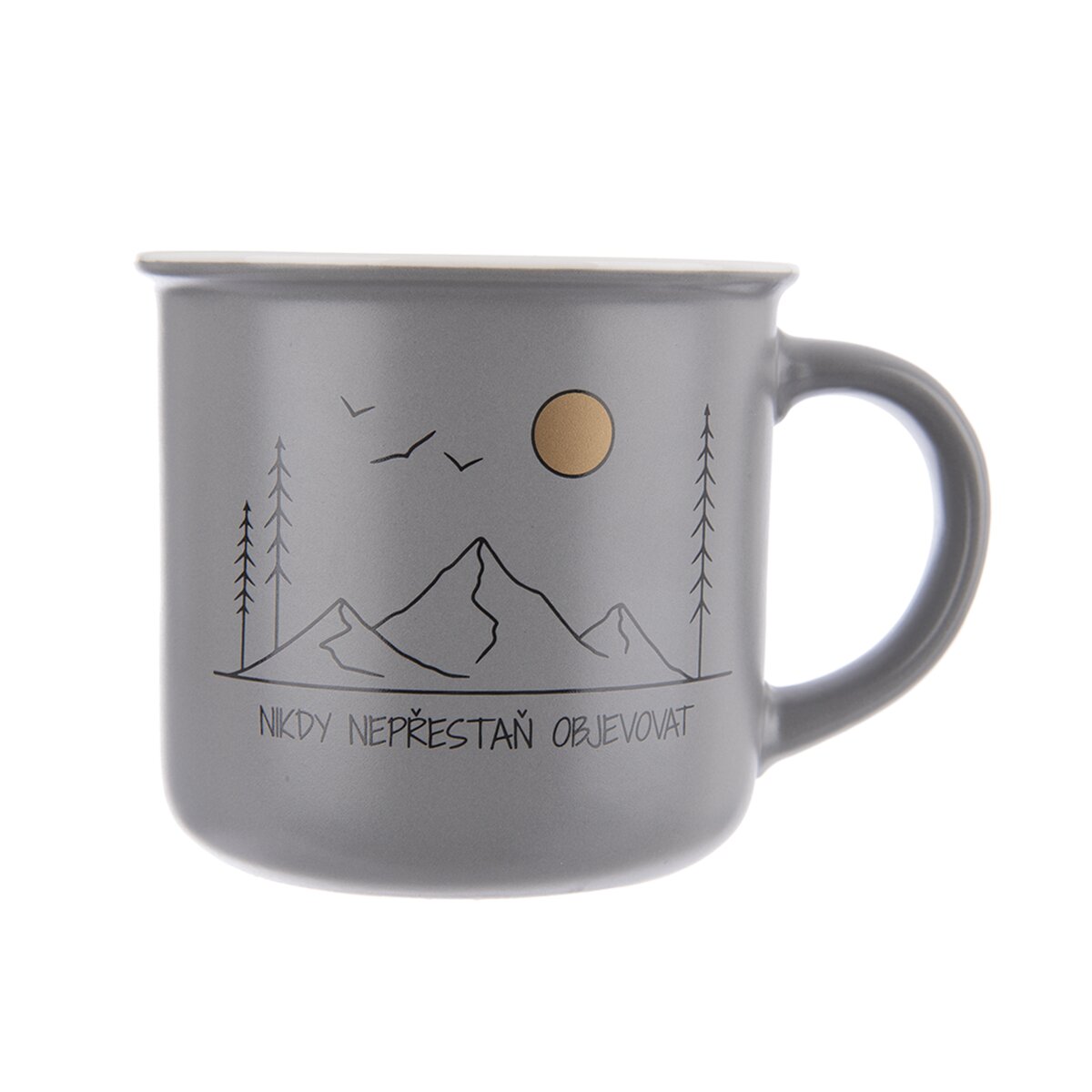 Proto se všem "dobrodruhům" bude hodit stylový hrnek Cestování, ať už na horký čaj nebo velkou kávu s mlékem. Tento šedý krasavec má objem 0,4 l a lze ho použít k podávání teplých nápojů, polévky do hrnečku nebo k ohřevu v mikrovlnné troubě. Zdobí jej tematický dekor a nápis NIKDY NEPŘESTAŇ OBĚVOVAT. Po použití jej lze mýt v myčce.