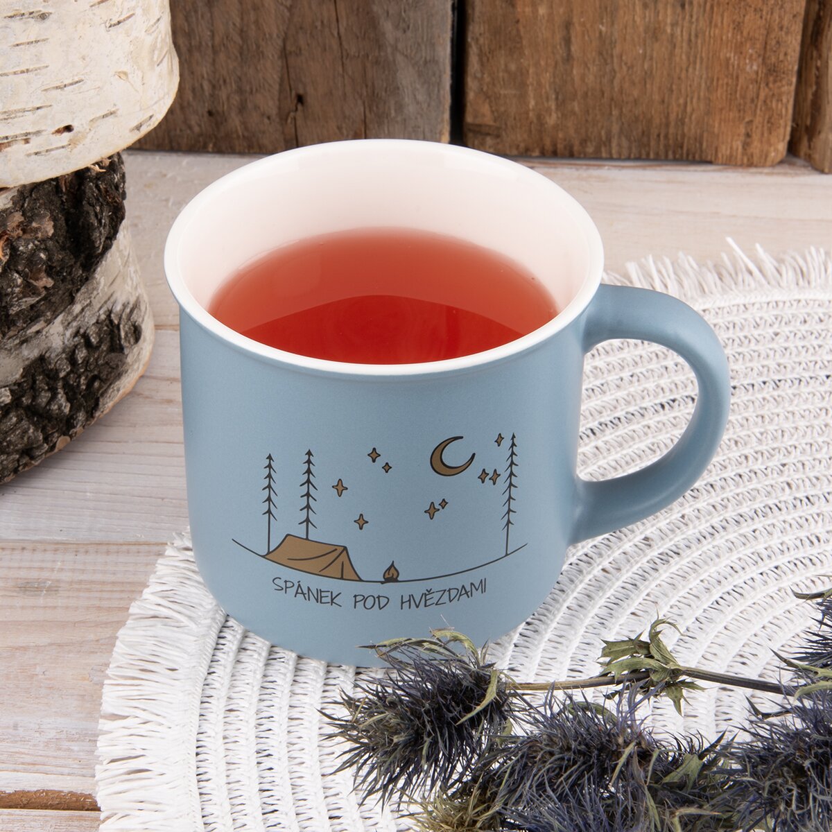 Proto se všem "dobrodruhům" bude hodit stylový hrnek Cestování, ať už na horký čaj nebo velkou kávu s mlékem. Tento modrý krasavec má objem 0,4 l a lze ho použít k podávání teplých nápojů, polévky do hrnečku nebo k ohřevu v mikrovlnné troubě. Zdobí jej tematický dekor a nápis SPÁNEK POD HVĚZDAMI. Po použití jej lze mýt v myčce.