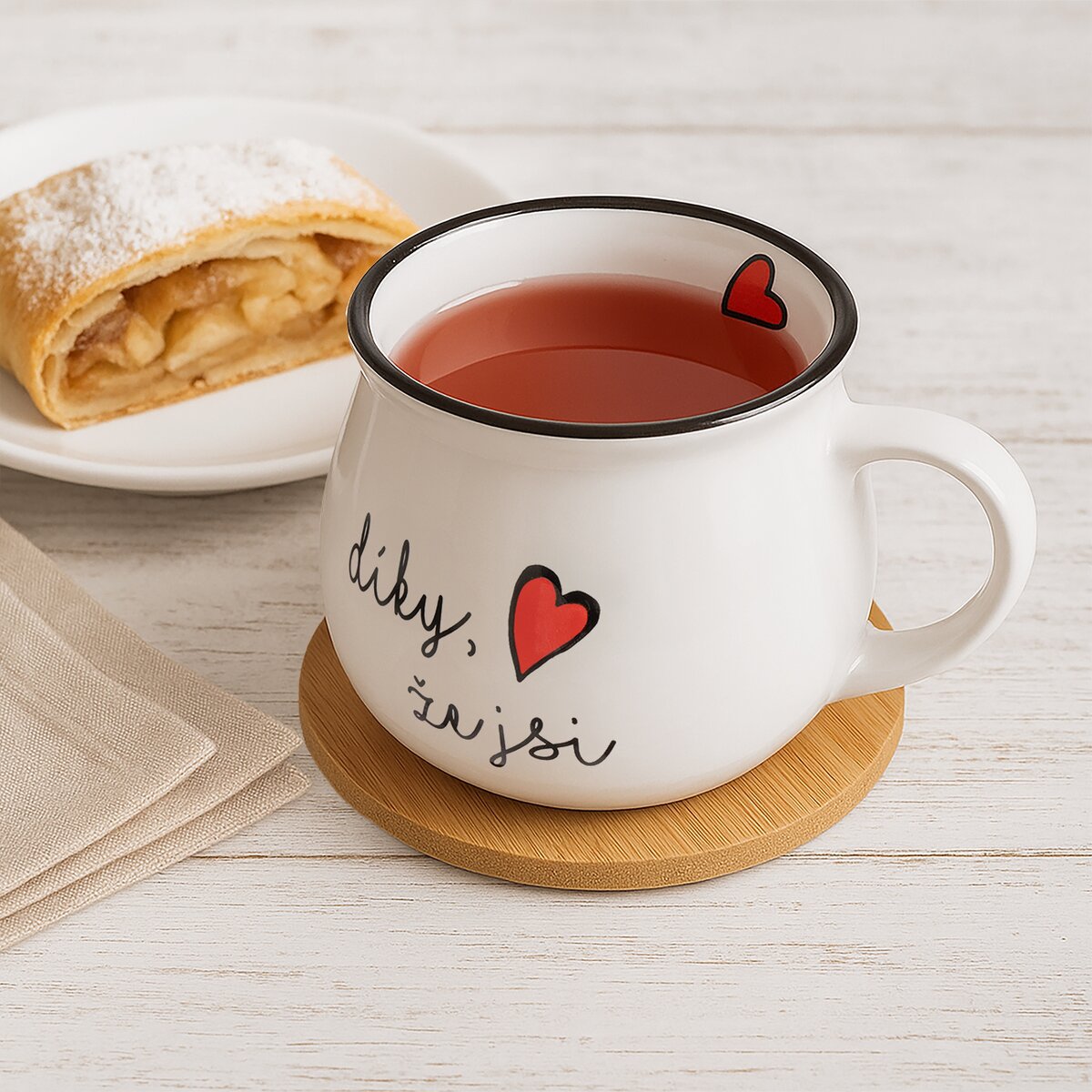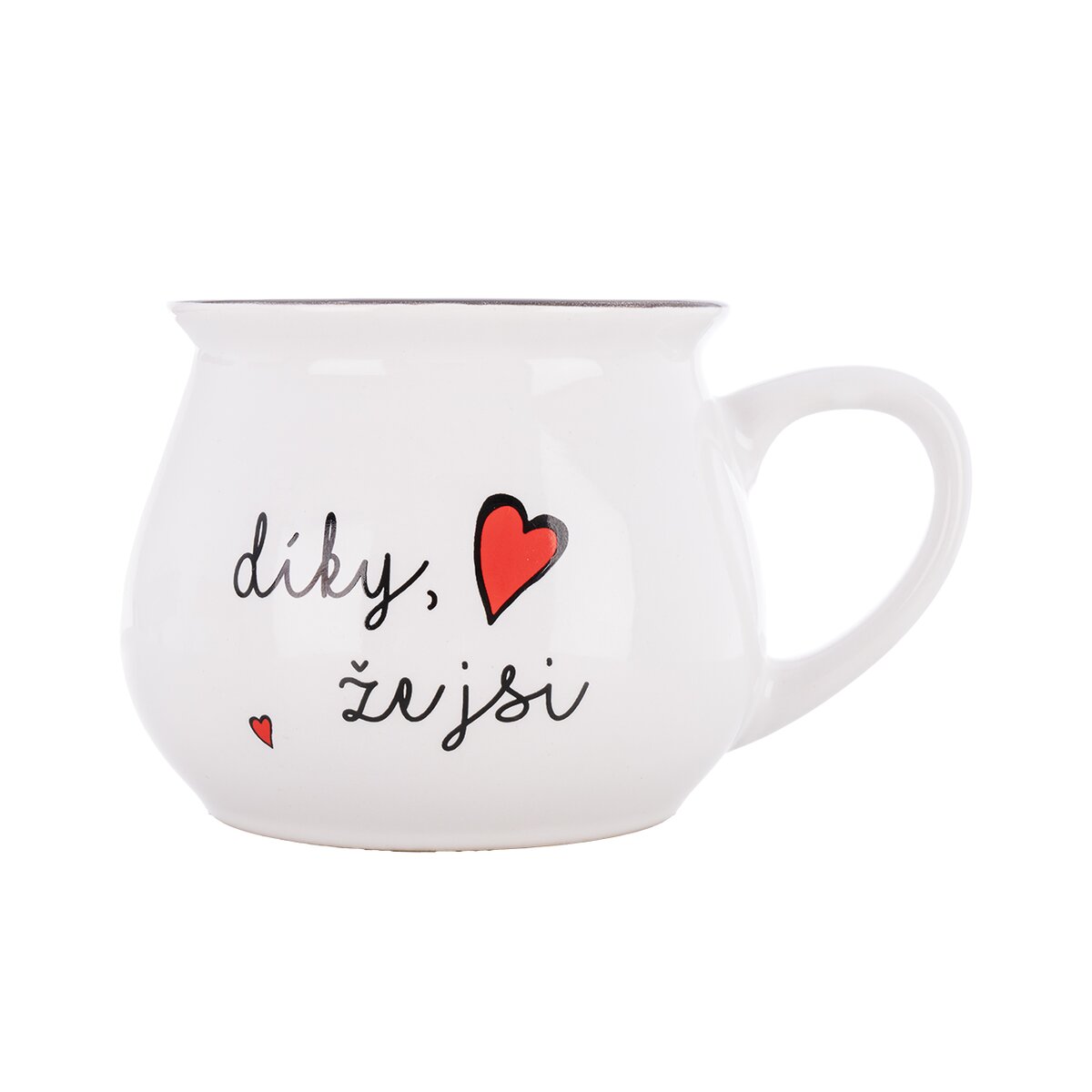 Kód produktu 132222Baculatý keramický hrnek o objemu 300 ml zdobí nápis "Díky, že jsi" a je určen k podávání teplých i studených nápojů.