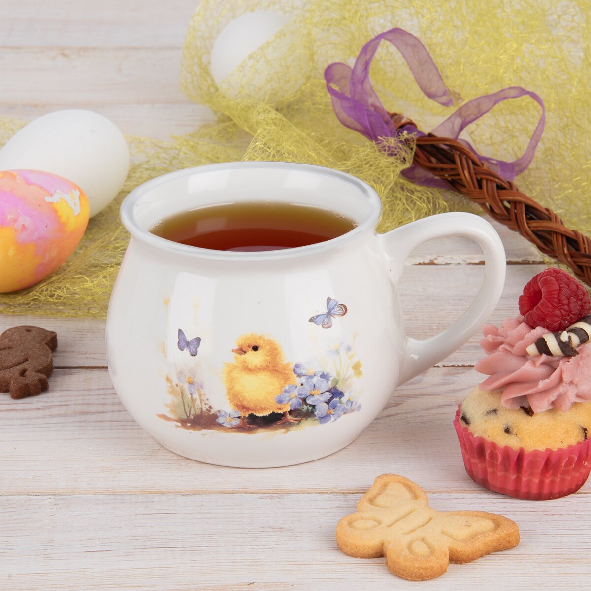Hrnek s uchem je zdoben z přední strany motivem roztomilého kuřátka a poletujícími motýlky a přímo se nabízí k popíjení horkého kakaa, čaje nebo bílé kávy. Vychutnejte si svůj oblíbený nápoj spolu s nadýchanou vánočkou, mazancem nebo čerstvými křupavými loupáky.
