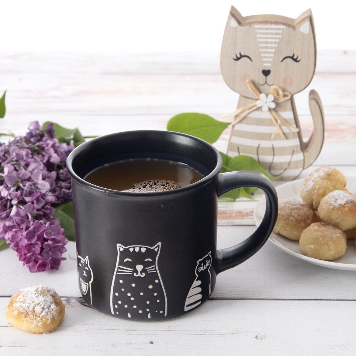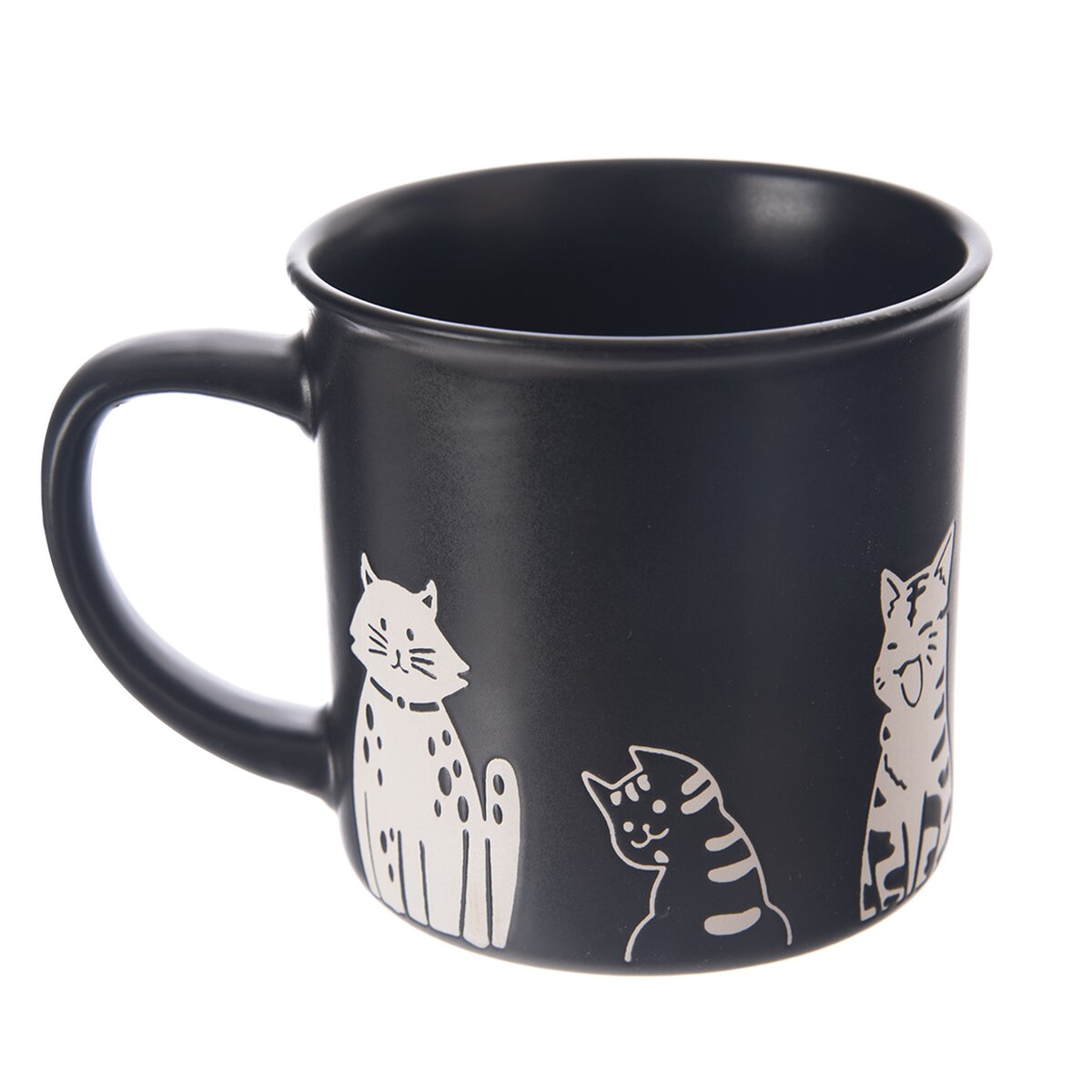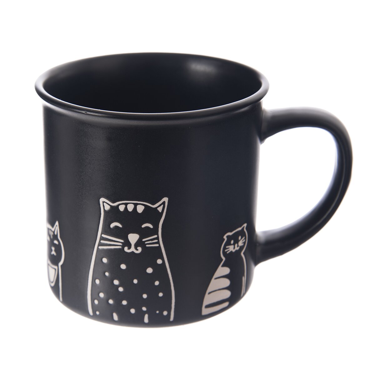 Kód produktu 129632Černý keramický hrnek o objemu 0,51 l zdobí bílý dekor koček.