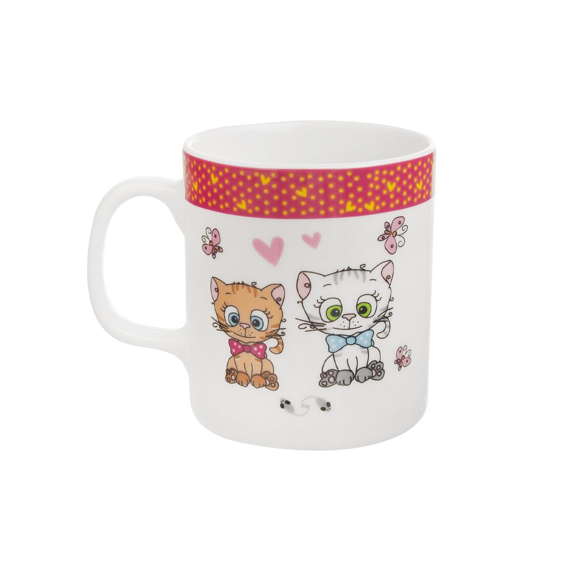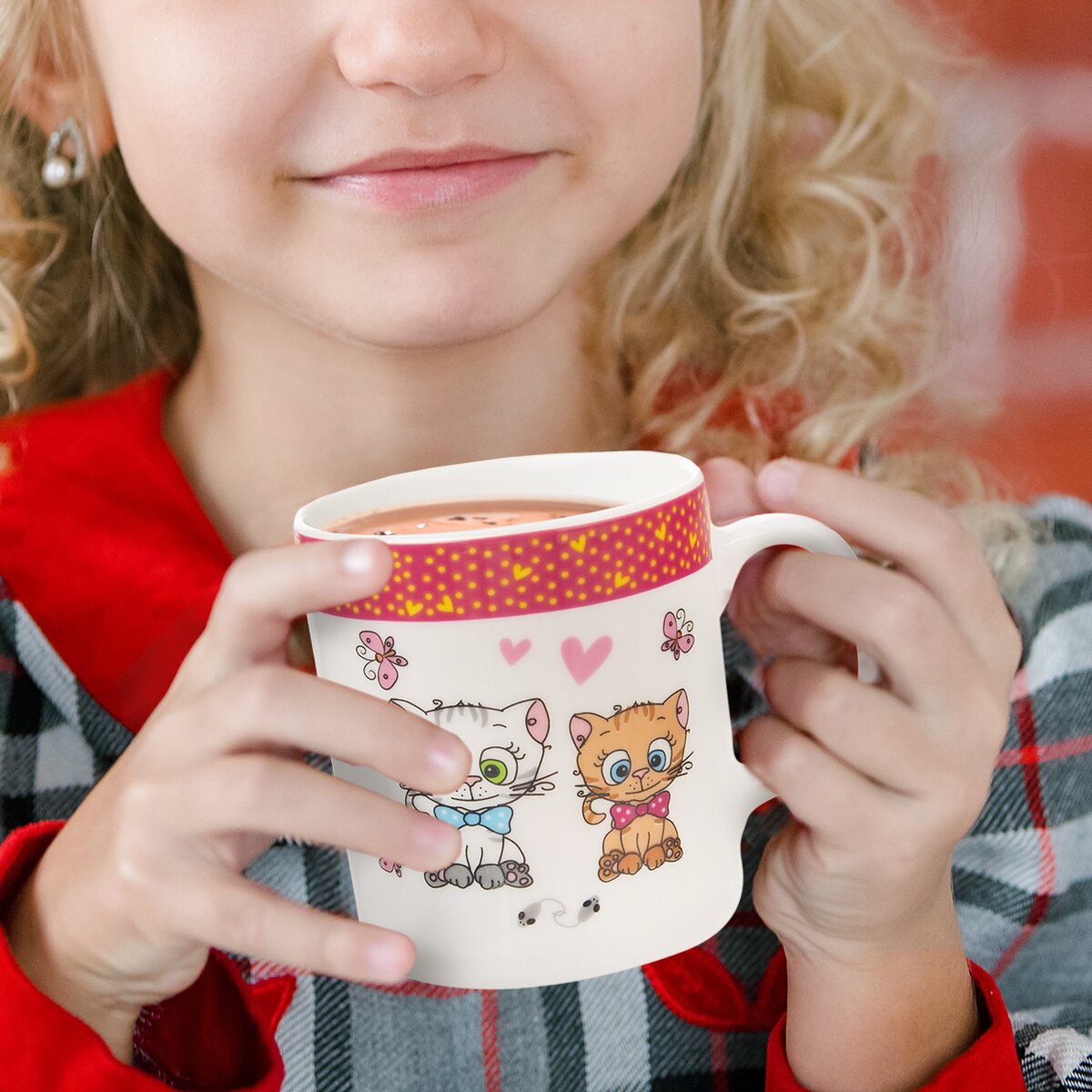 Menší porcelánový hrneček s hezkým dekorem dvou roztomilých kocourků s mašlí je jako stvořený k doplňování tekutin pro děti od 3 let. Malí nezbedové si z něho vychutnají slaďoučké kakao, čaj, ochucené mléko i domácí šťávu.