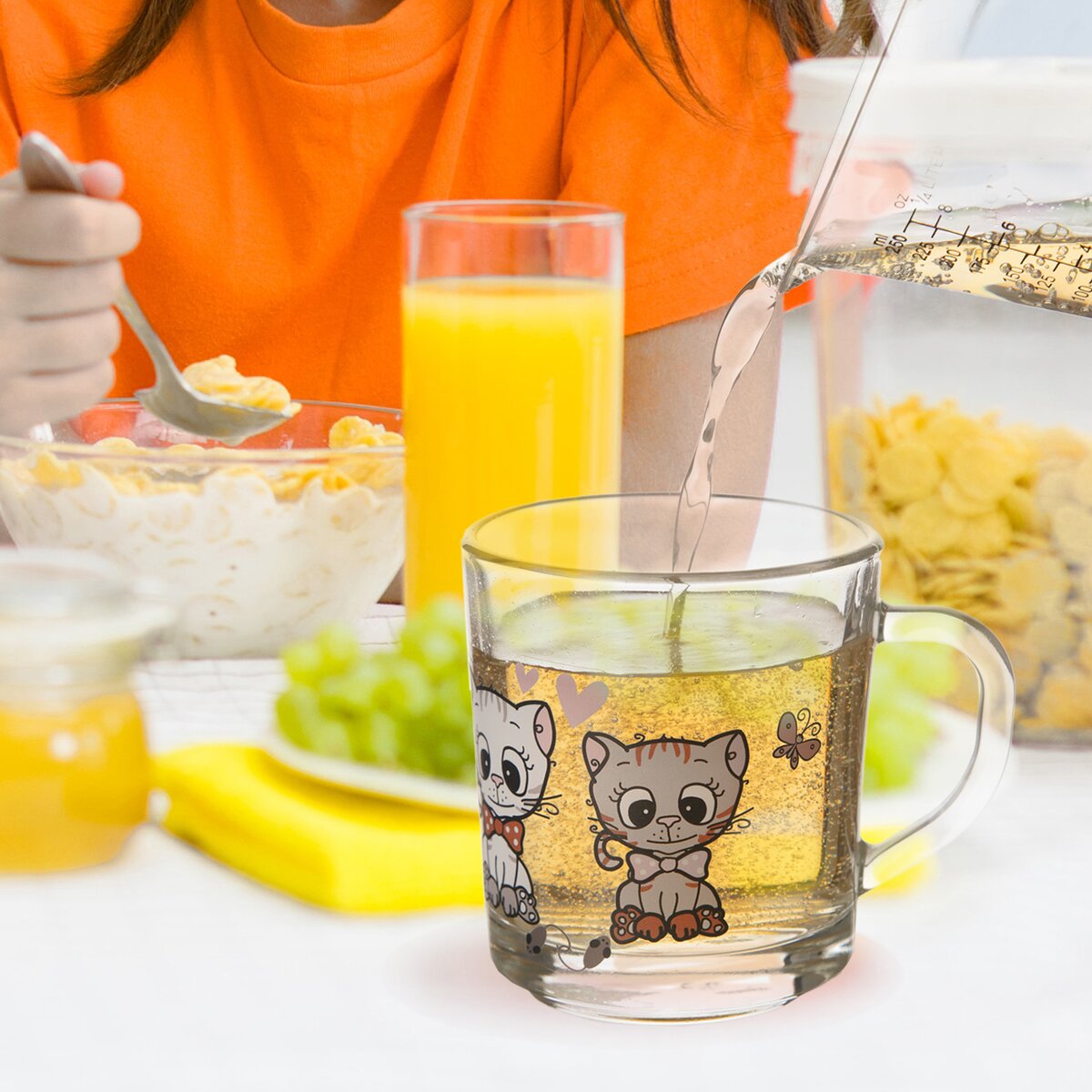 Skleněný hrneček s uchem vykouzlí úsměv na tváři dítěte, díky roztomilému dekoru z dílny Orion designérů z něho bude s chutí pít. Budete tak mít přehled o pitném režimu dítěte.