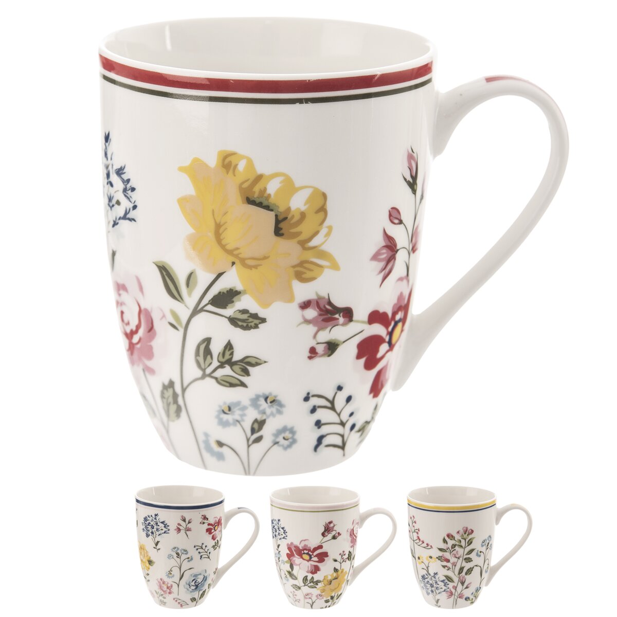 Kód produktu 128873Bílý porcelánový hrnek s uchem, o objemu 0,35 l, který zdobí romantické květinové motivy.