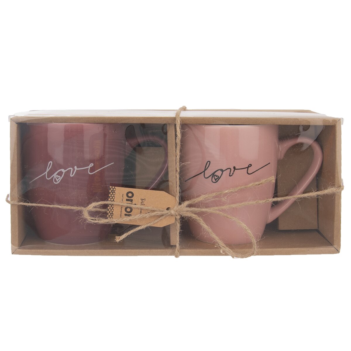 Elegantní sada dvou porcelánových hrnků, která zapadne díky svým neutrálním barvám do každého interiéru. Mají objem 380 ml, díky čemuž v nich můžete servírovat ovocný čaj, horkou čokoládu i větší kávu. Krásným detailem je i nápis LOVE v jednoduchém designu.