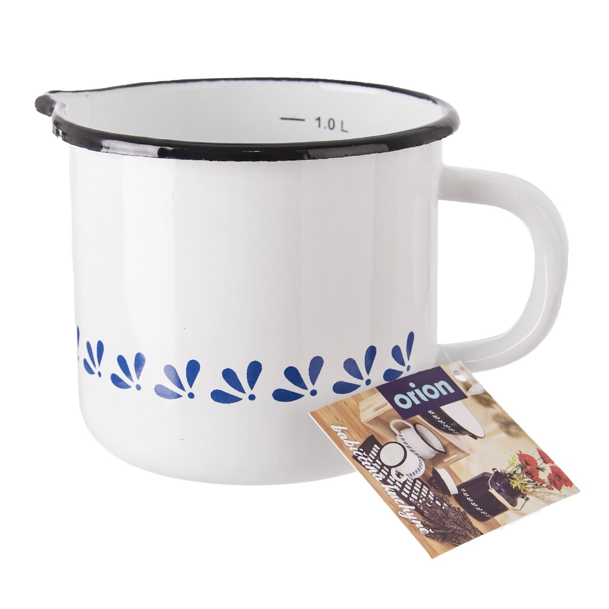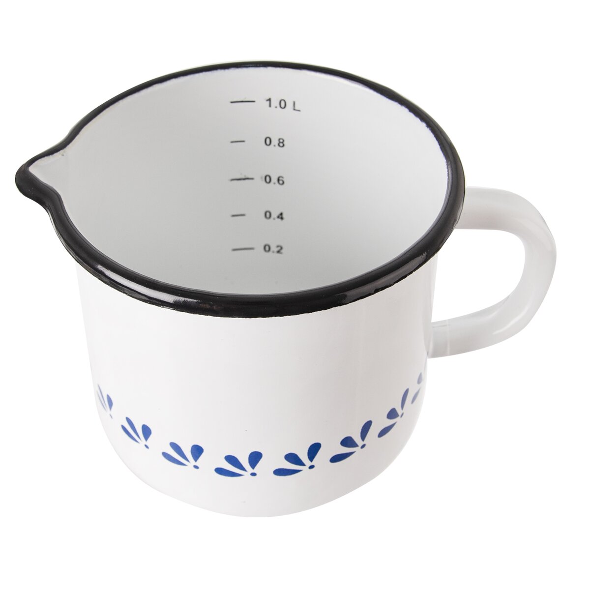 Kód produktu 113513Bílý smaltovaný hrnek MODROBÍLÁ o objemu 1,2 l s výlevkou a vnitřní odměrkou.