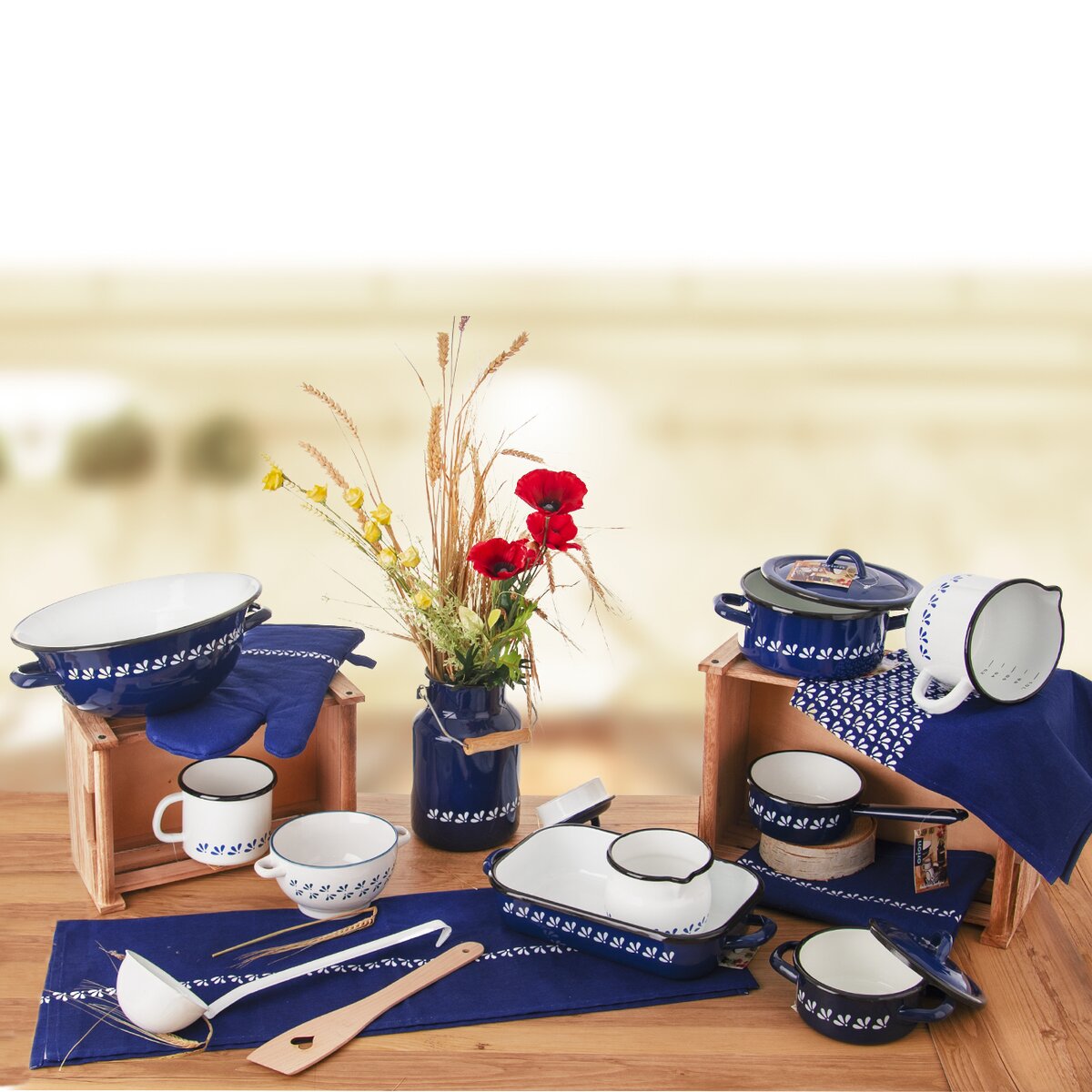 Je praktický a dobře vypadá. To splňuje tento bílý smaltovaný hrnek s průměrem 12 cm a dekorem modrých kvítků, které jsou inspirované modrotiskem, tradiční technikou potisku textilií.