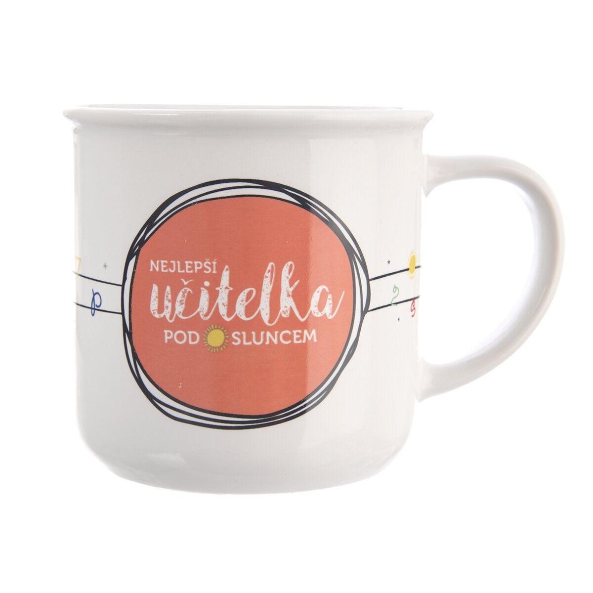 Kód produktu 129637Bílý porcelánový hrnek o objemu 0,34 l s nápisem NEJLEPŠÍ UČITELKA je určen k podávání teplých nápojů i jako stylový dárek oblíbené učitelce.