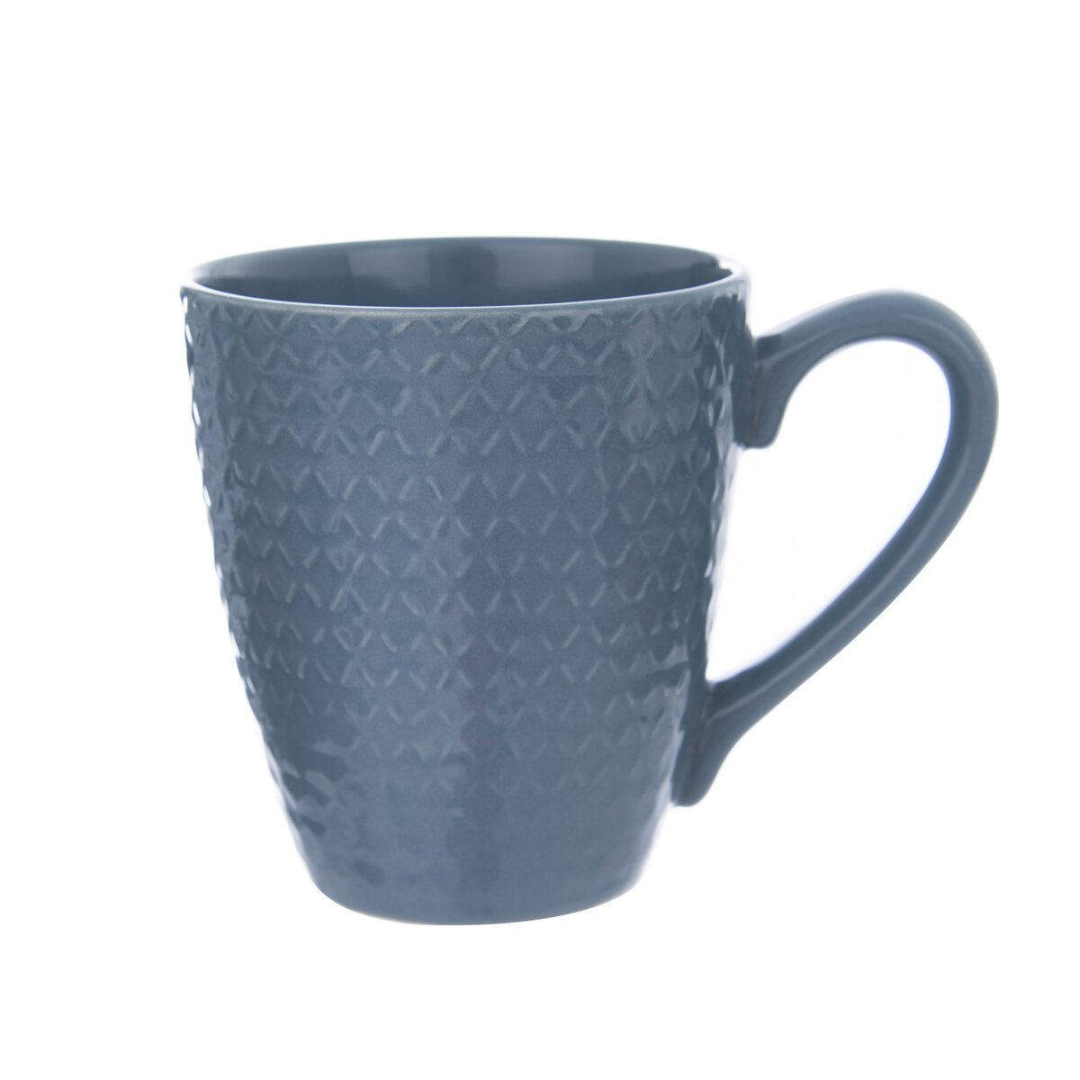 Hrnek s uchem s plastickým dekorem. Materiál: keramika. Vhodný do myčky i MVT. V několika barevných variantách. Rozměry: objem 0,43 l, pr. 9,5 cm, v. 10,5 cm.