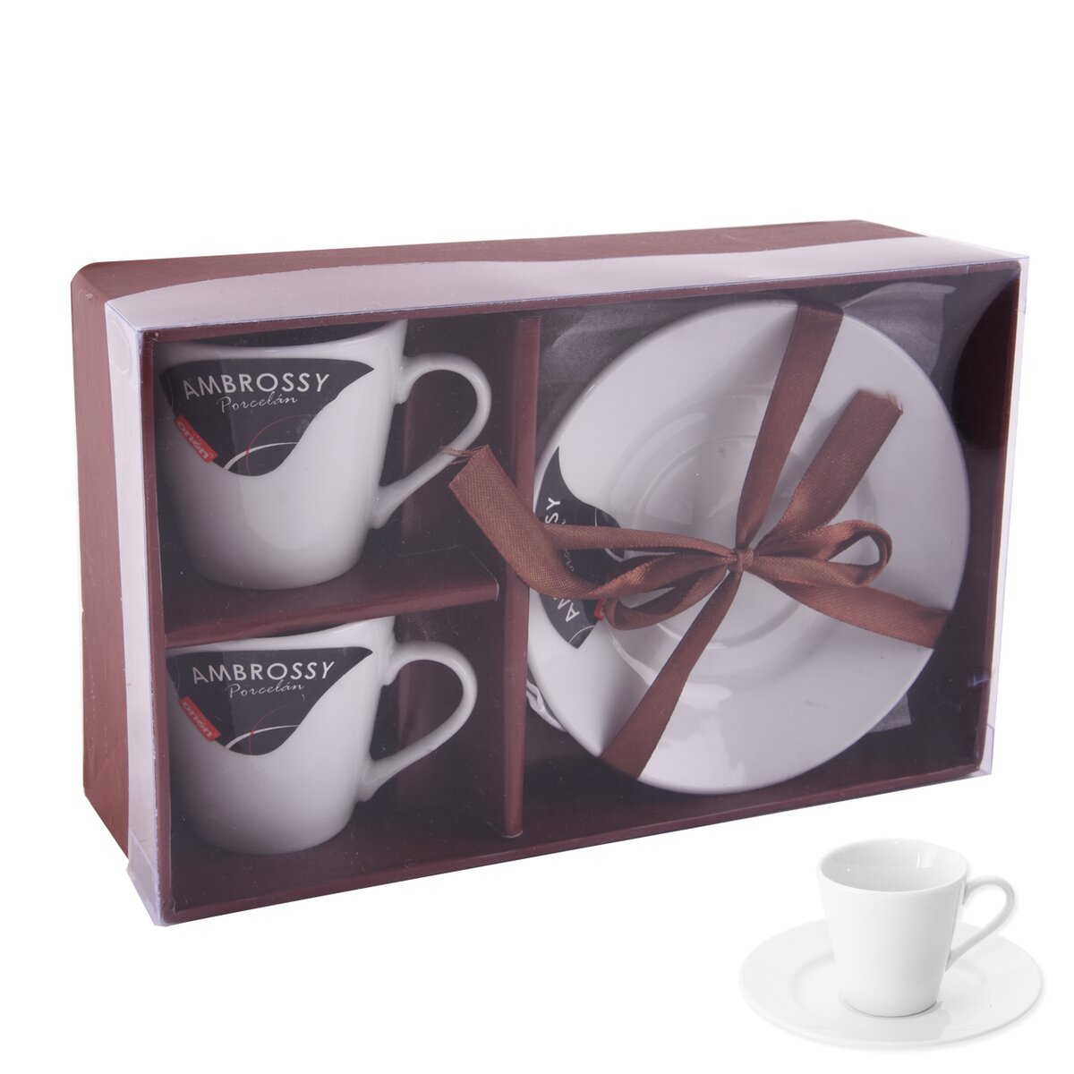Kód produktu 125485Hrnek s uchem a podšálek. Materiál: porcelán. Barva bílá. Sada 2+2 ks. Rozměry: objem 0,09 l, pr. š. 6 cm, pr. podš. 12 cm.