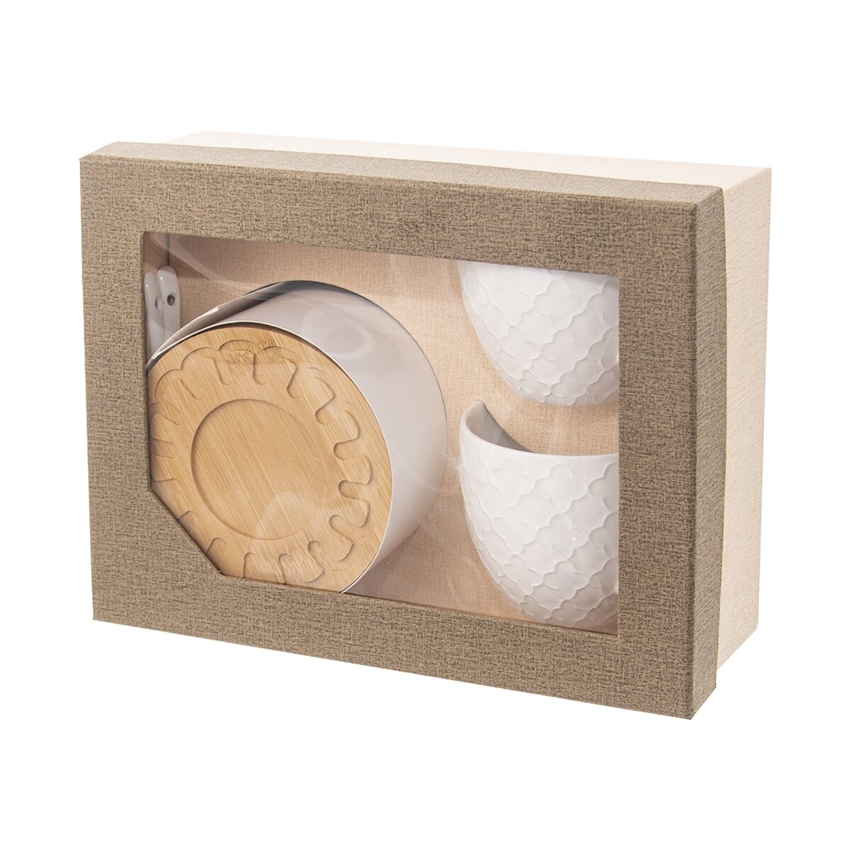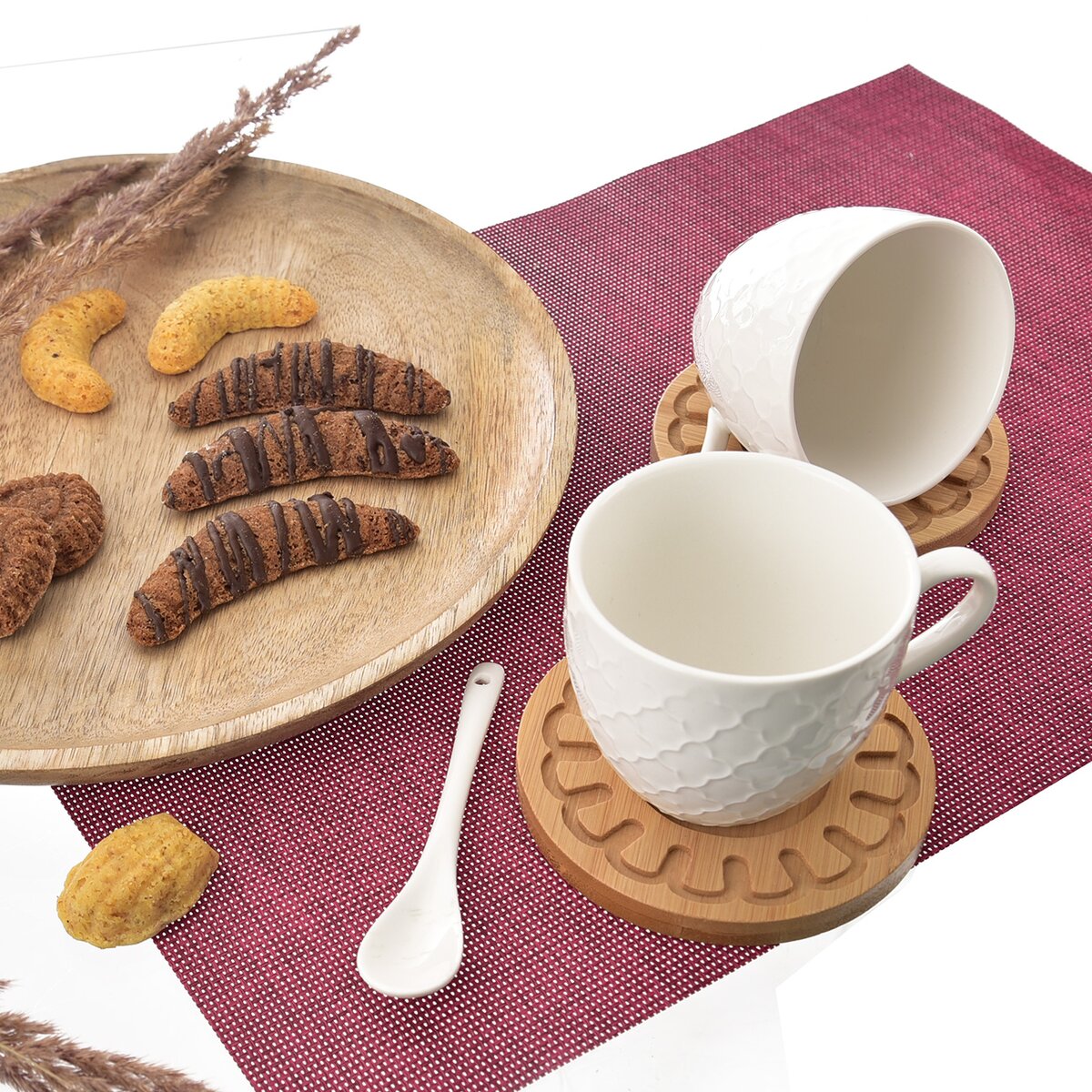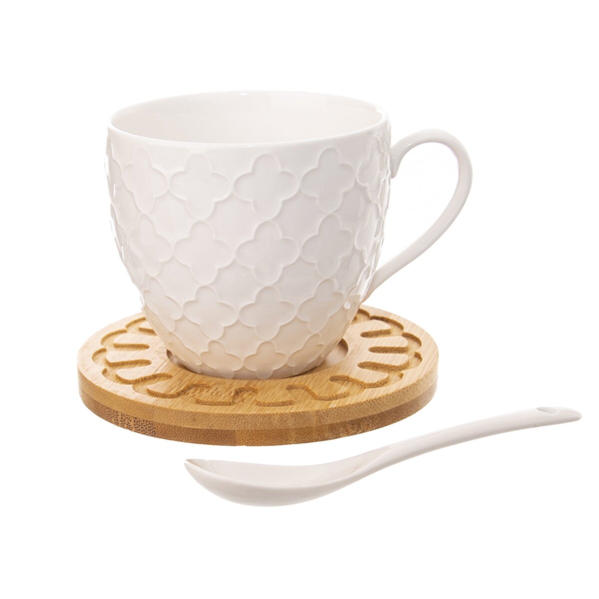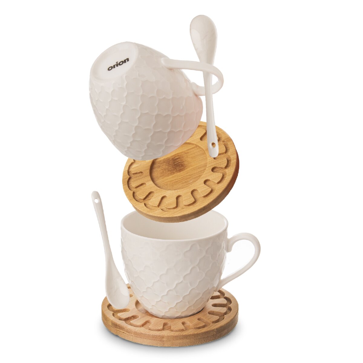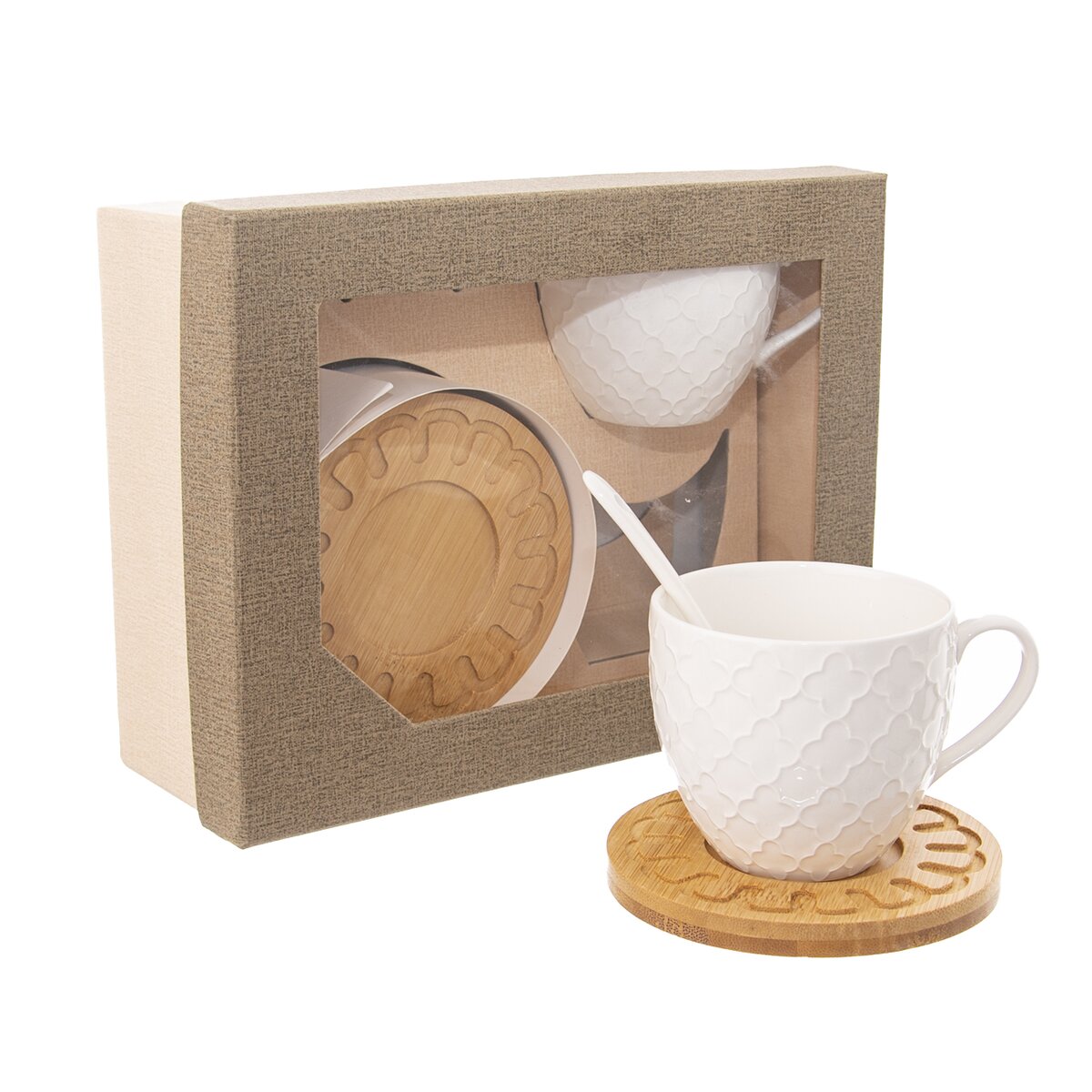 Minimalismus a elegance – to představuje sada nádobí WHITELINE pro váš stůl. Tvoří ji dva bílé porcelánové hrnky s jemným reliéfem, které se díky objemu 250 ml výborně hodí například na ovocný čaj nebo větší kávu. V sadě dále najdete porcelánové lžičky a podšálky z bambusového dřeva, které jsou zdobené menšími rytinami.