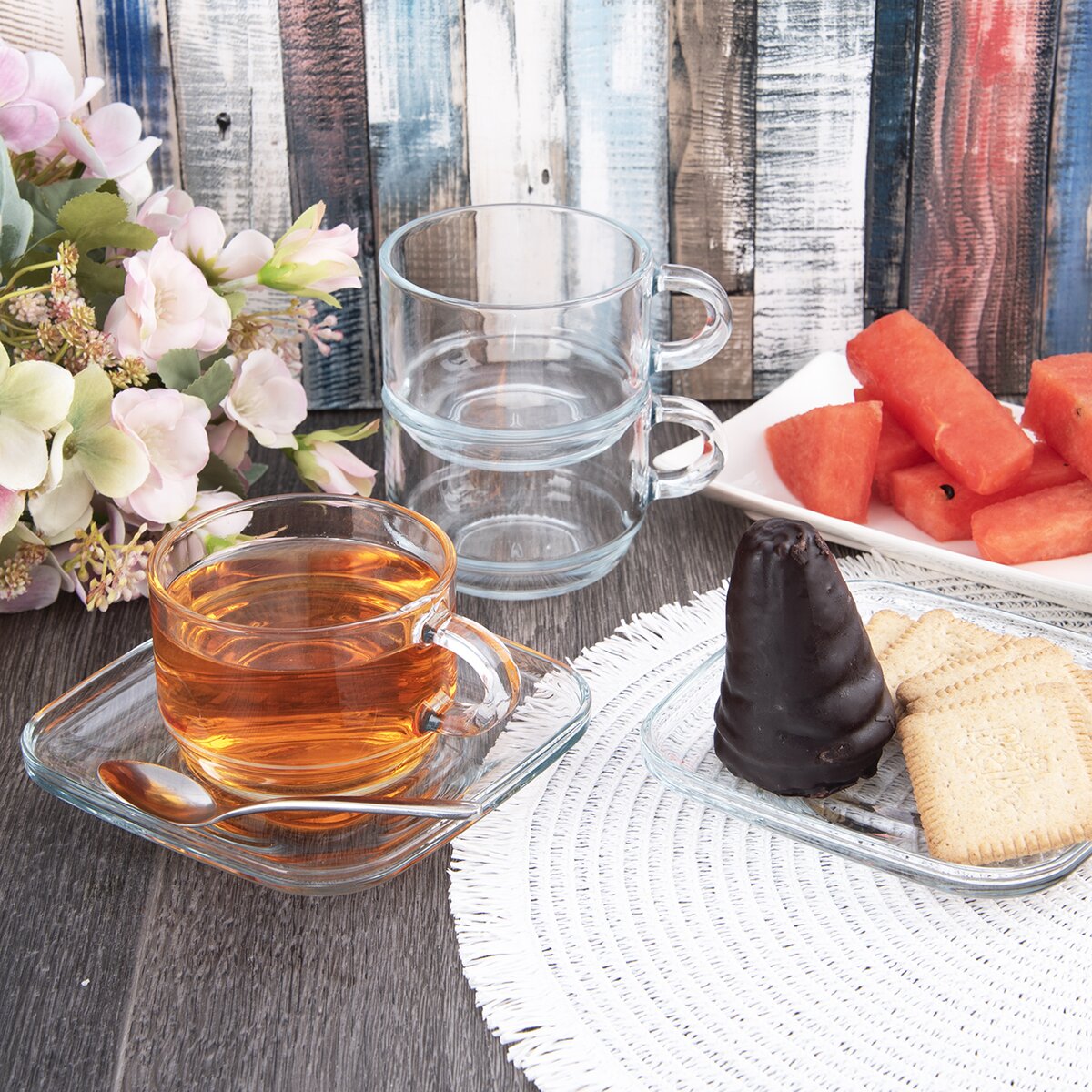 Skleněný hrneček na kávu či čaj s podšálkem umocní požitek ze silné voňavé kávy. Hrnečky jsou stohovatelné, takže zaberou jen málo místa při uložení. Díky tomu se hodí k použití v domácnosti, ve firemním baru či kuchyňce nebo při hotelové bufetové snídani, kde se hosté sami obslouží.