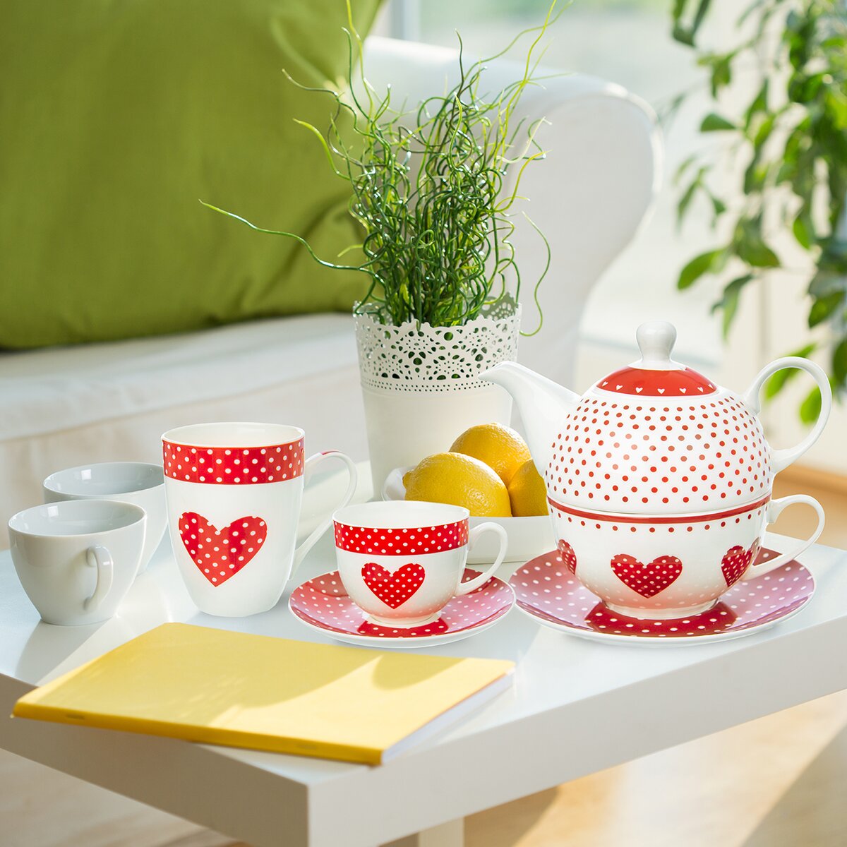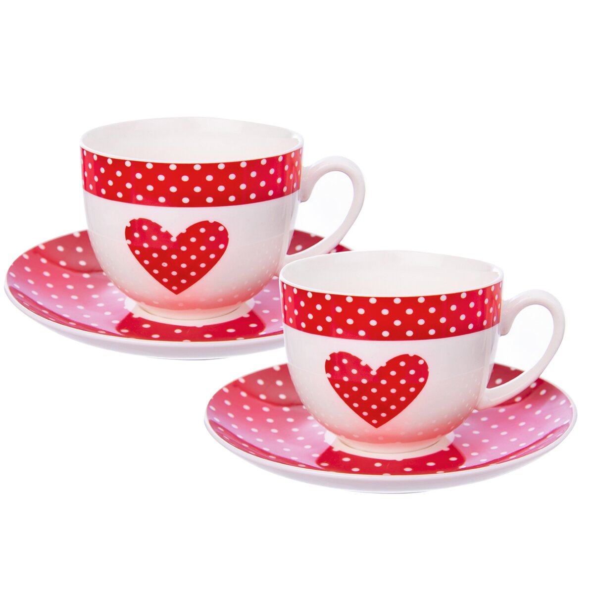 Kód produktu 127284Sada dvou porcelánových šálků o objemu 0,28 l s ladícím podšálkem v dekoru puntíků a srdce v bílo-červeném provedení.