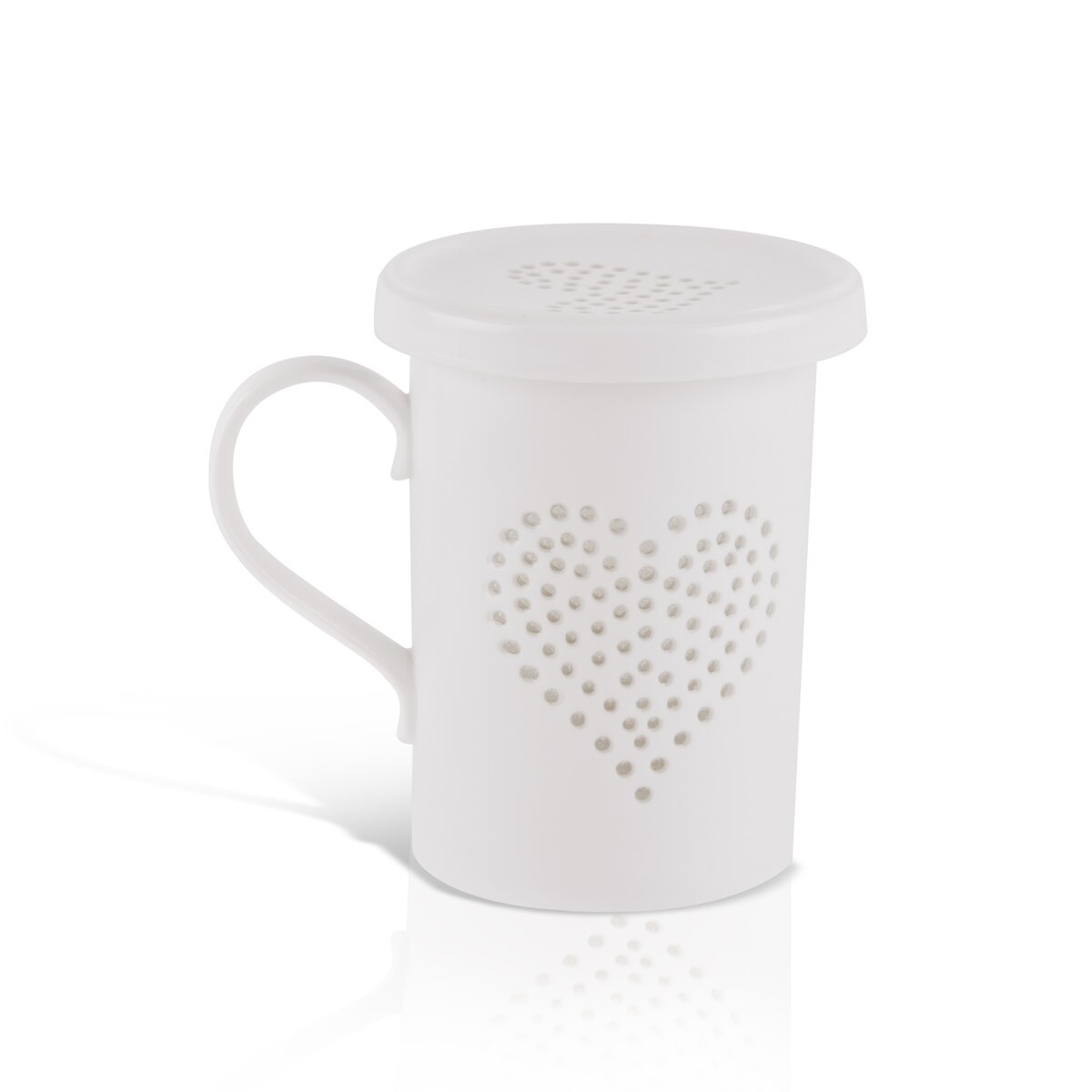 Hrnek se zajímavým dekorem. Poklička může sloužit také jako podtácek na sáček s vylouhovaným čajem. Materiál: porcelán. Rozměry: objem 0,42 l, pr. 8 cm, v. 11 cm.