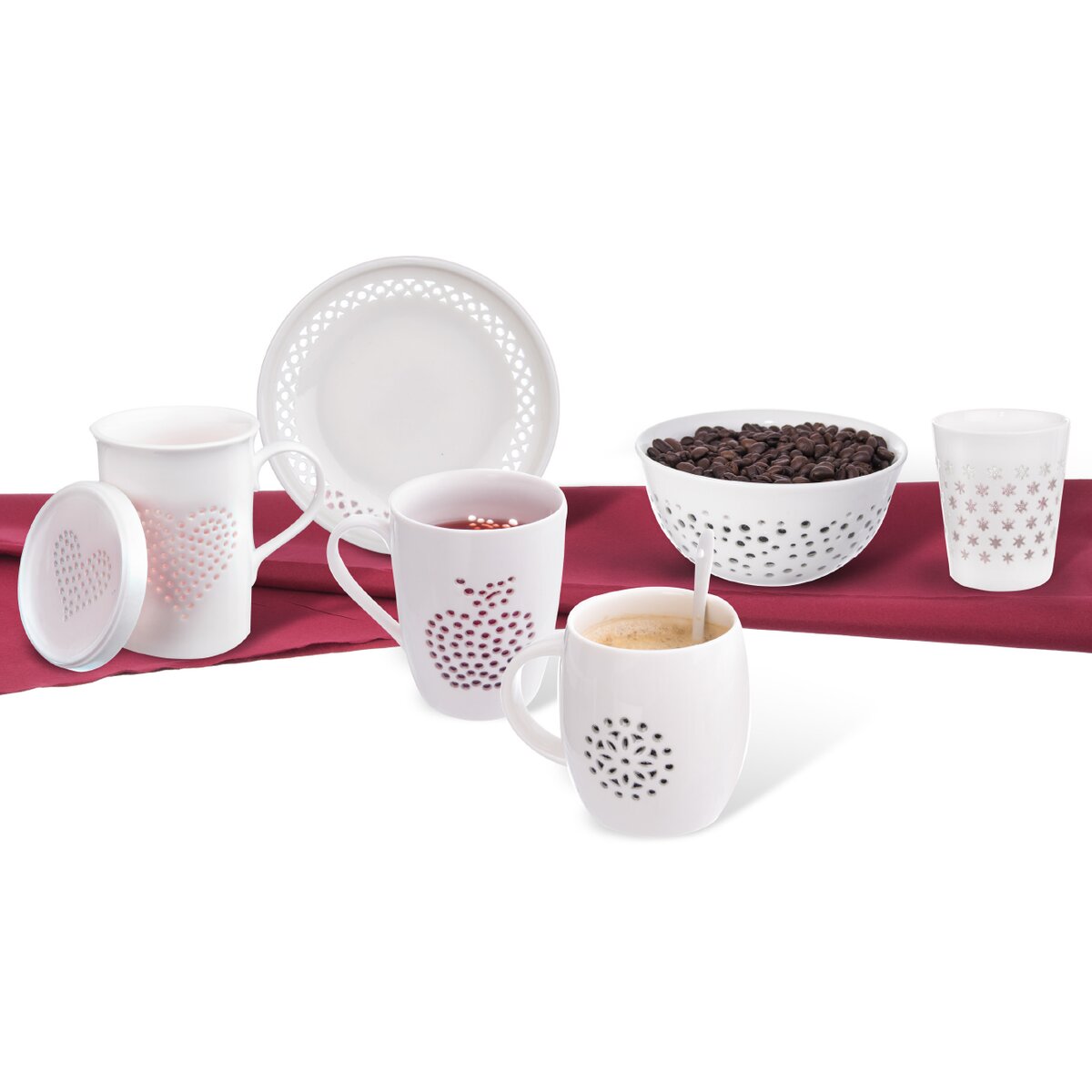 Kód produktu 127208Hrnek se zajímavým dekorem. Poklička může sloužit také jako podtácek na sáček s vylouhovaným čajem. Materiál: porcelán. Rozměry: objem 0,42 l, pr. 8 cm, v. 11 cm.