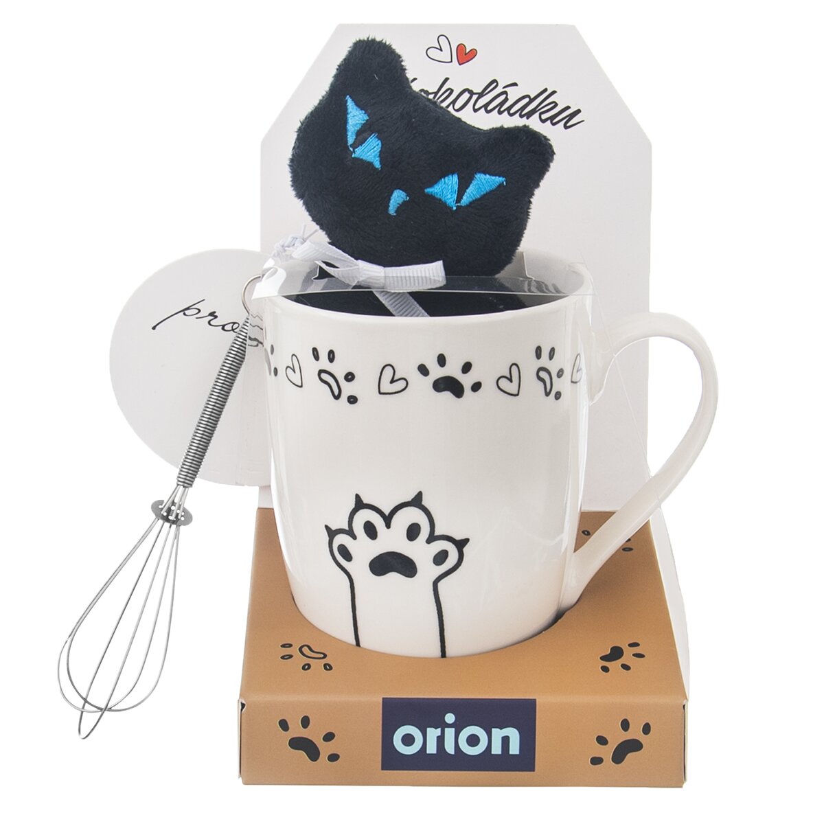 Kód produktu 128848Keramický hrnek objemu 0,38 l s motivem kočičích tlapek, doplněný o nerezovou metličku a roztomilou plyšovou kočičku, uloženou v dárkovém balení.