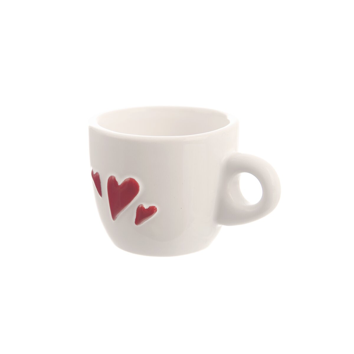 I silné espresso si můžete vychutnat v romanticky laděném hrnku z keramiky - kameniny. Trojice červených srdcí na bílém podkladu přímo vybízí k tomu, udělat si snídani do postele nebo se trochu zastavit při ranním shonu a zasnít se pohledem z okna.