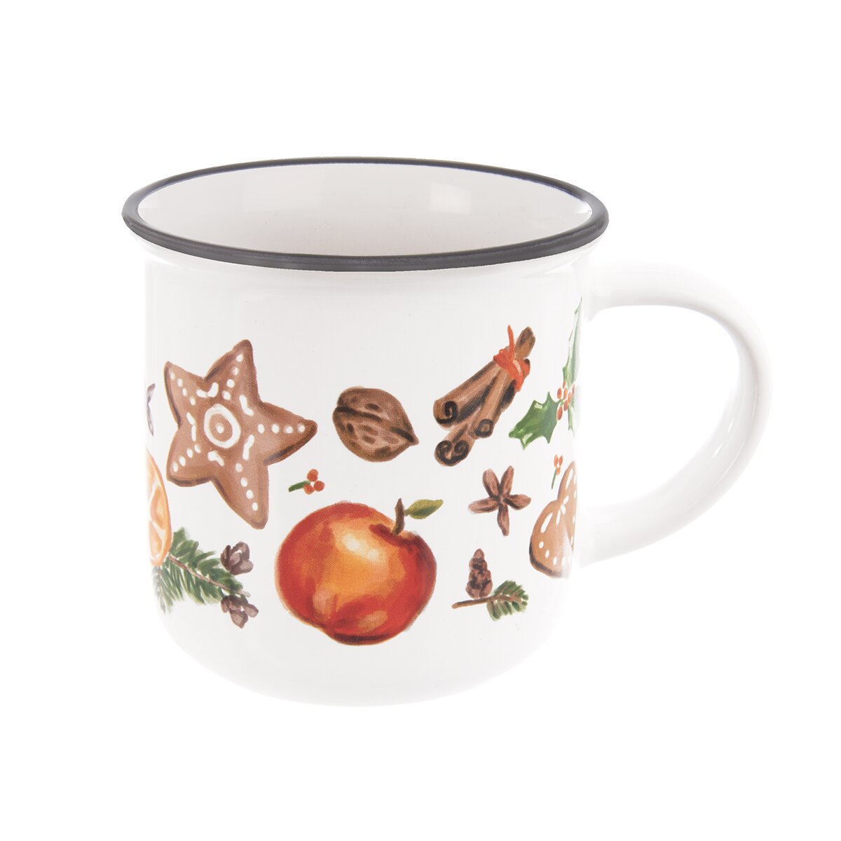 Kód produktu 132207Keramický hrnek s vánočním dekorem plným ovoce, perníčků a voňavého koření má objem 350 ml. Je určen k podávání teplých i studených nápojů.