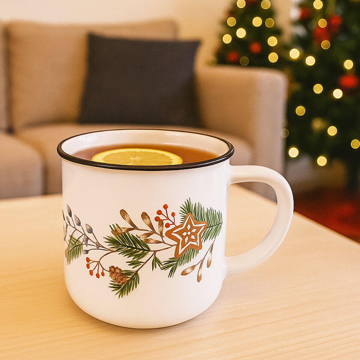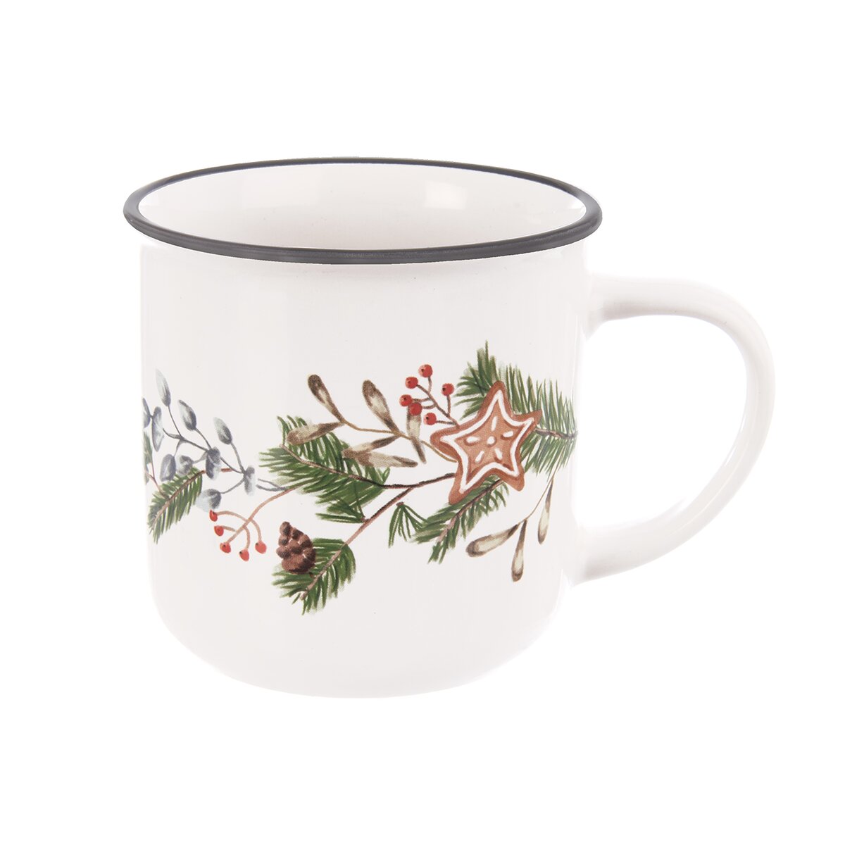 Kód produktu 132208Keramický hrnek s vánočním dekorem plným perníčků a zelených větviček má objem 350 ml. Je určen k podávání teplých i studených nápojů.