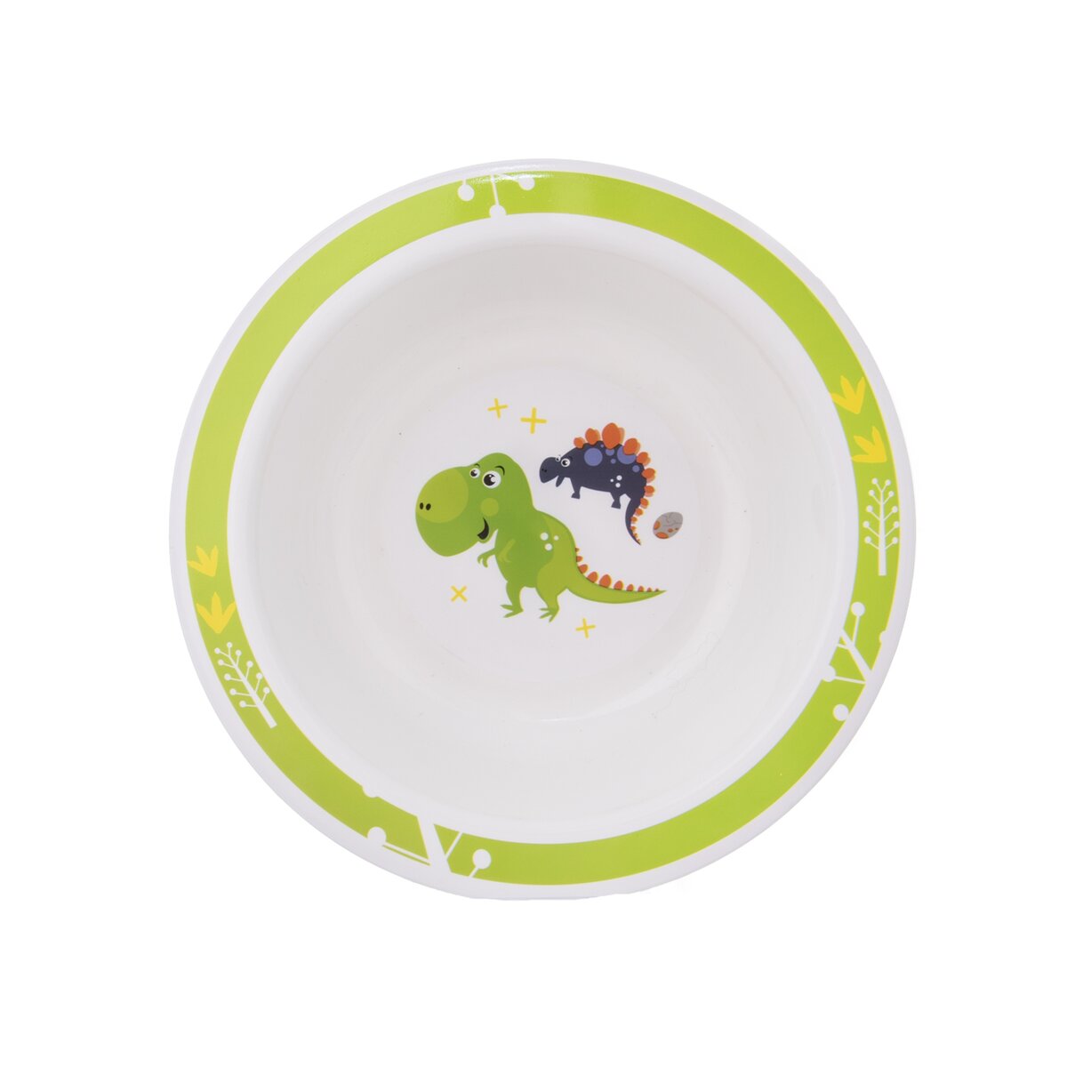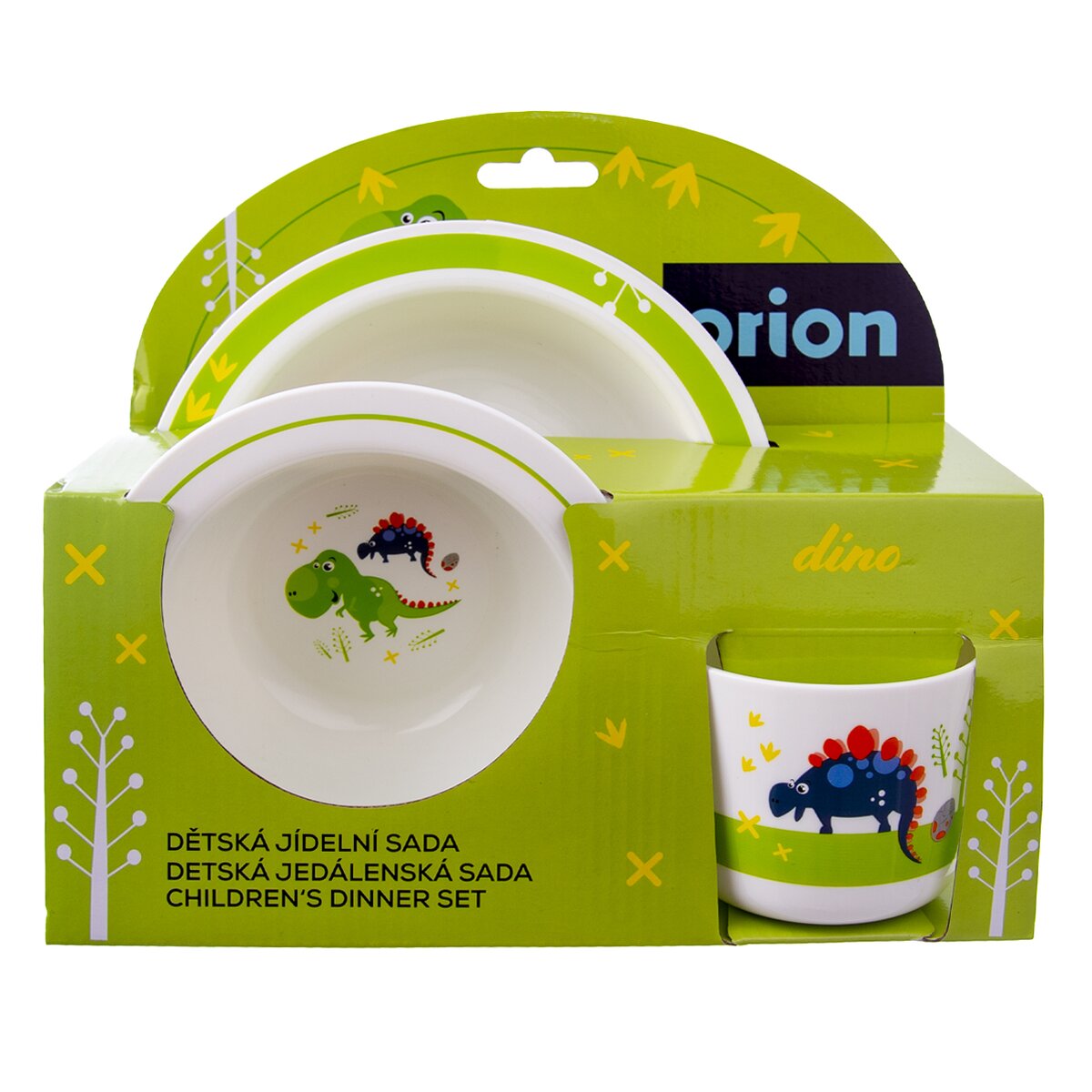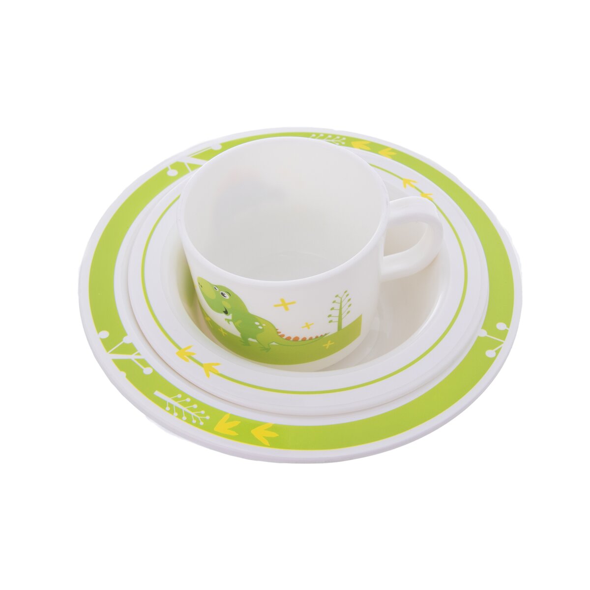 Kód produktu 112349Plastová jídelní sada DINO tvořená hrnkem o objemu 0,25 l, talířem a dvěma hlubokými miskami o průměru 14 cm a 17,5 cm.