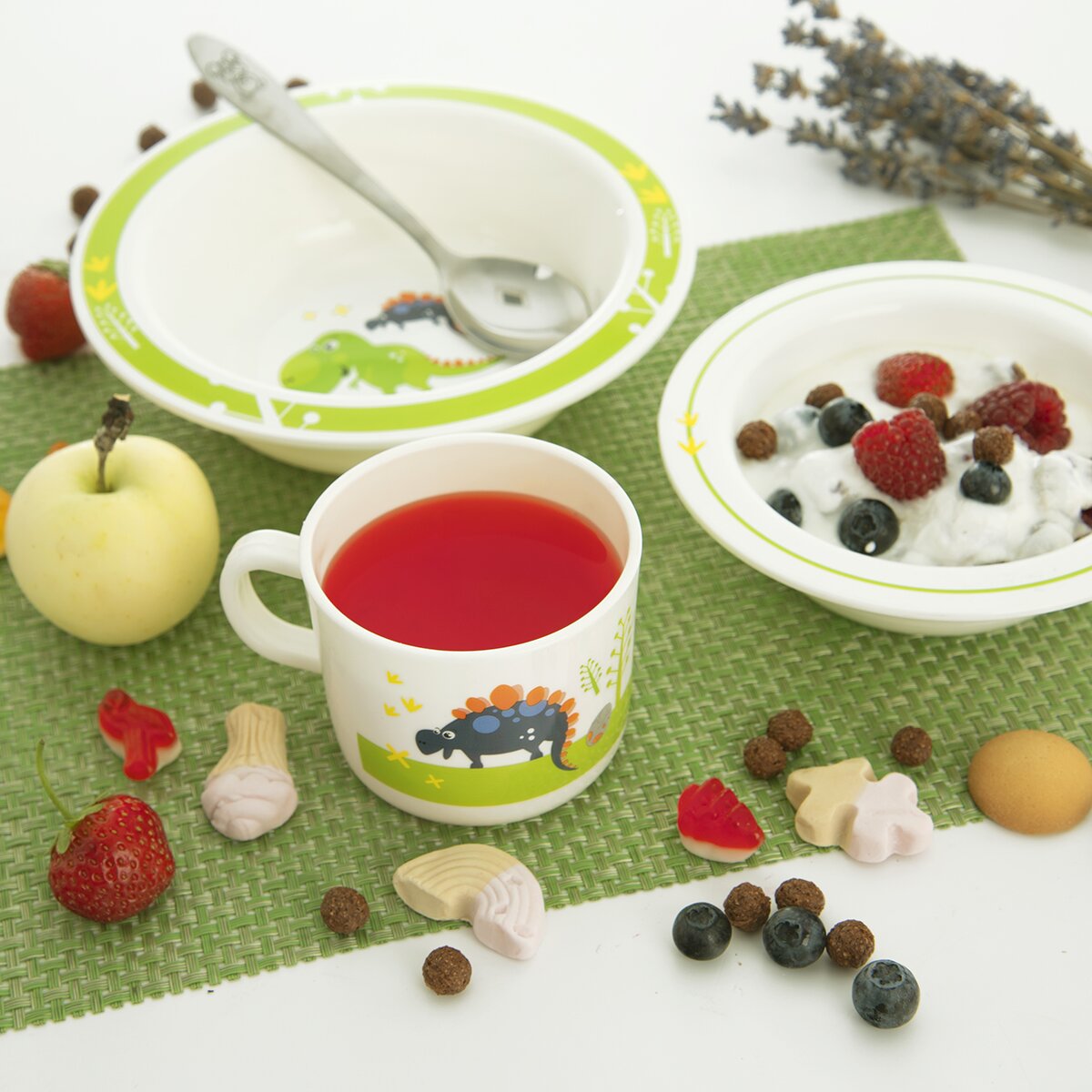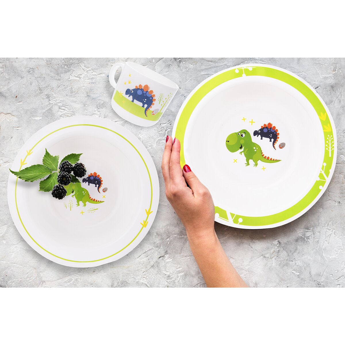Hlavním motivem je roztomilý obrázek dvou dinosaurů, okraje misek jsou zvýrazněny pruhem. Nádobí může do myčky i mikrovlnné trouby.