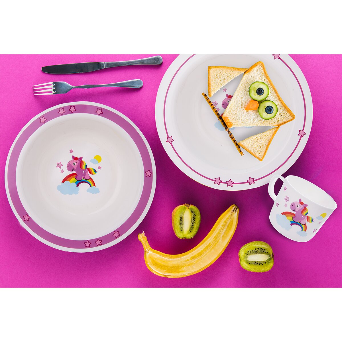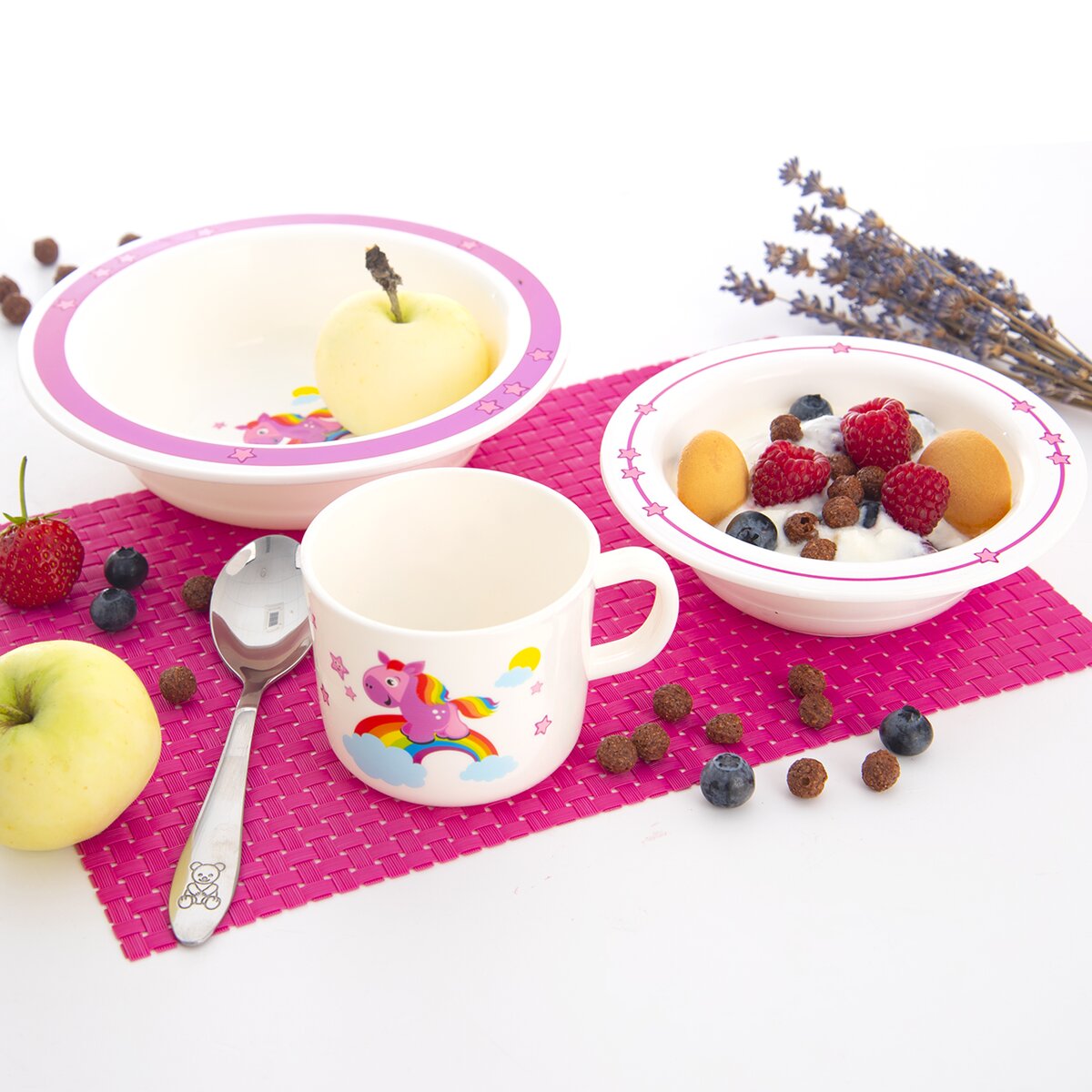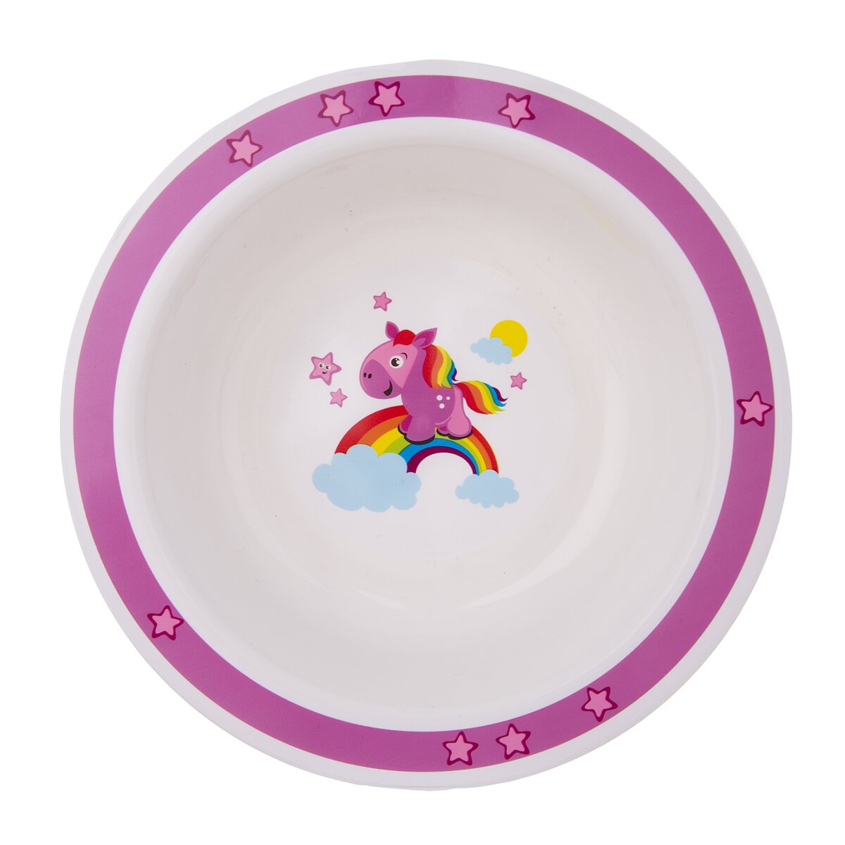 Růžový koník prohánějící se po nebesích. Proč stojí na duze? A kam asi utíká? Tato nebeská jídelní sada zaujme pozornost nejednoho malého strávníka.