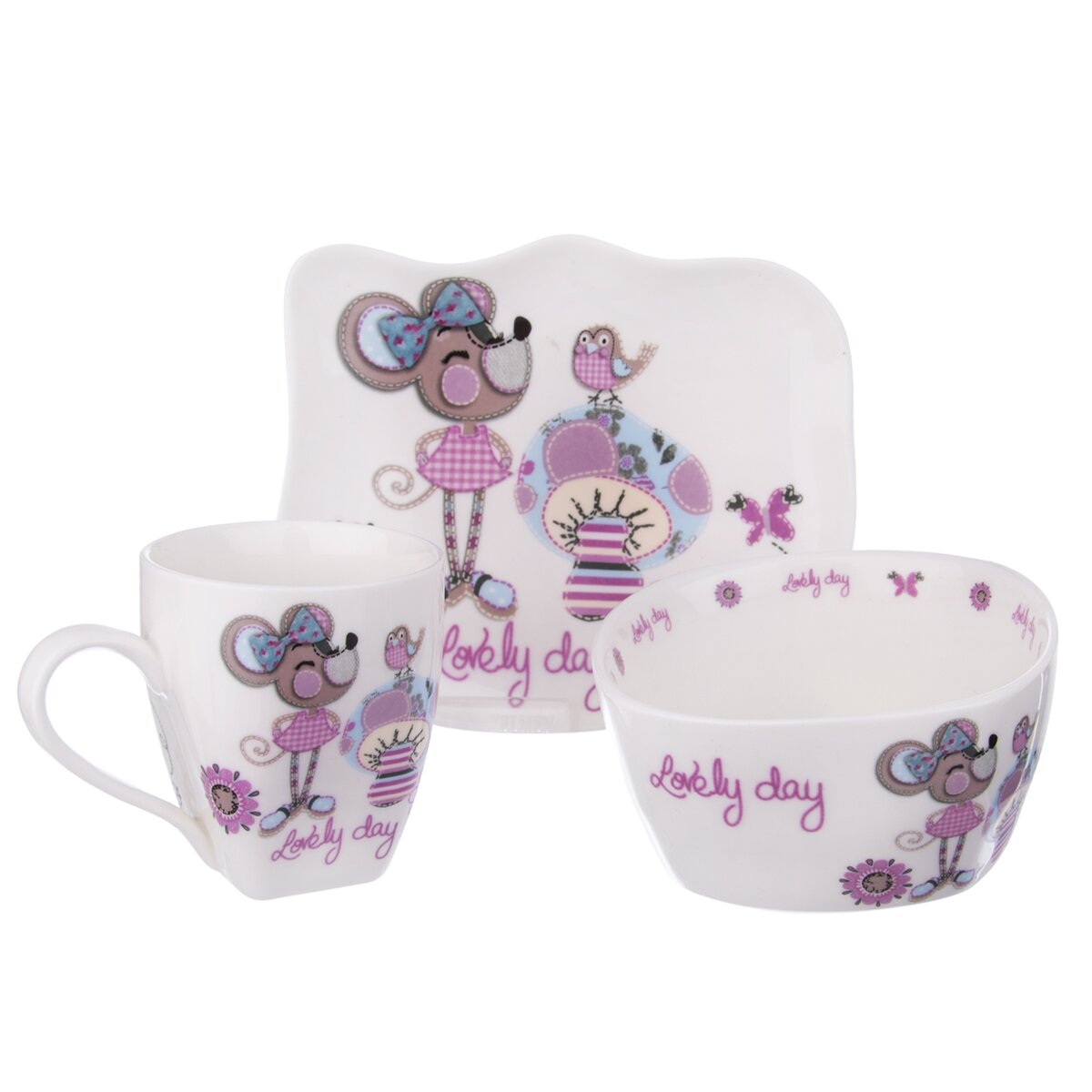 Krásná porcelánová jídelní sada s roztomilou myškou a růžovým nápisem, kterou si zamiluje i vaše dítě. Tvoří ji hrneček o objemu 200 ml, miska o rozměrech 12×12×5,5 cm a hranatý mělký talíř o rozměrech 17,5×15 cm.