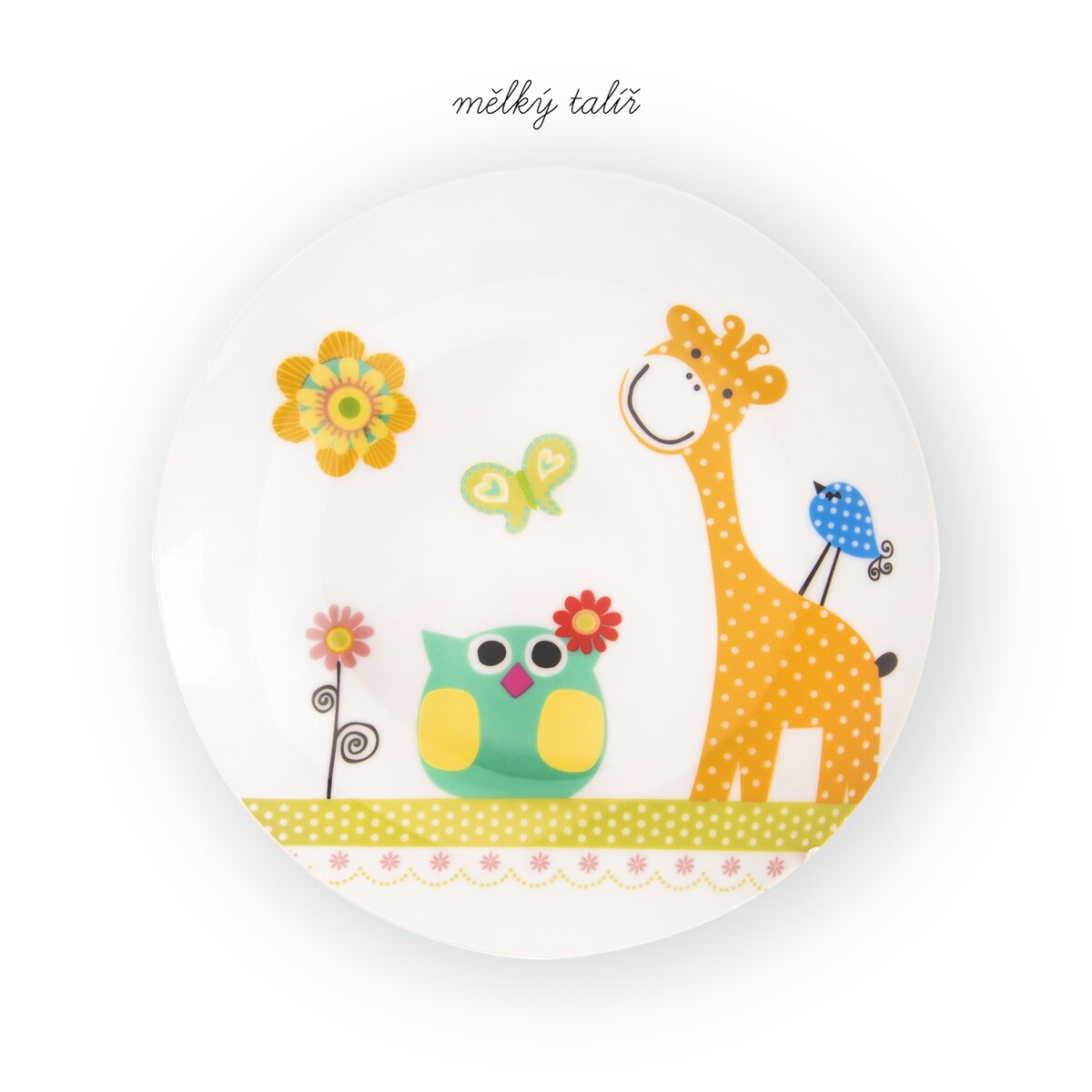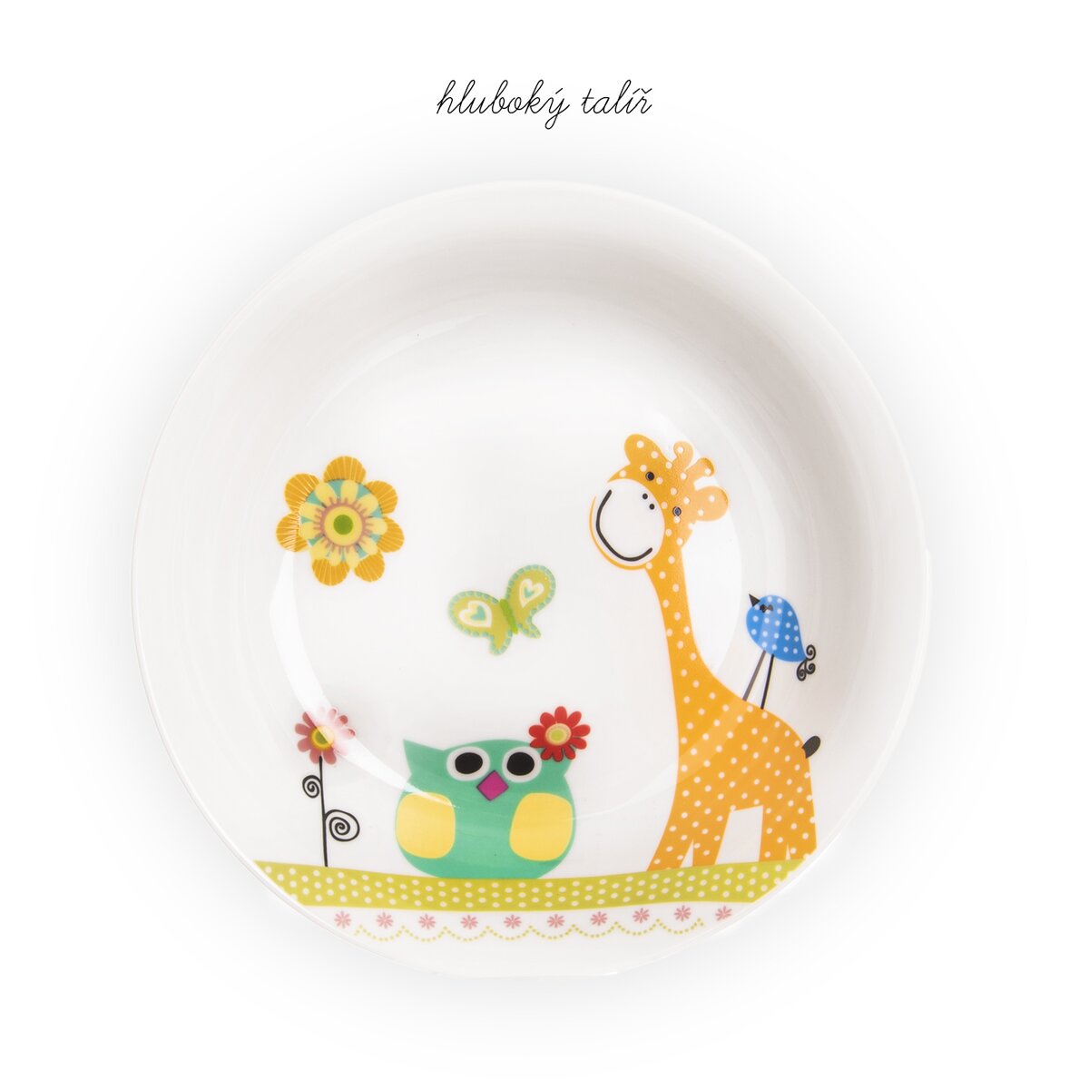 Kód produktu 112340Porcelánová jídelní sada ŽIRAFA tvořená hrnečkem o objemu 0,225 l, hlubokým talířem o průměru 19 cm a mělkým talířem o průměru 21 cm.