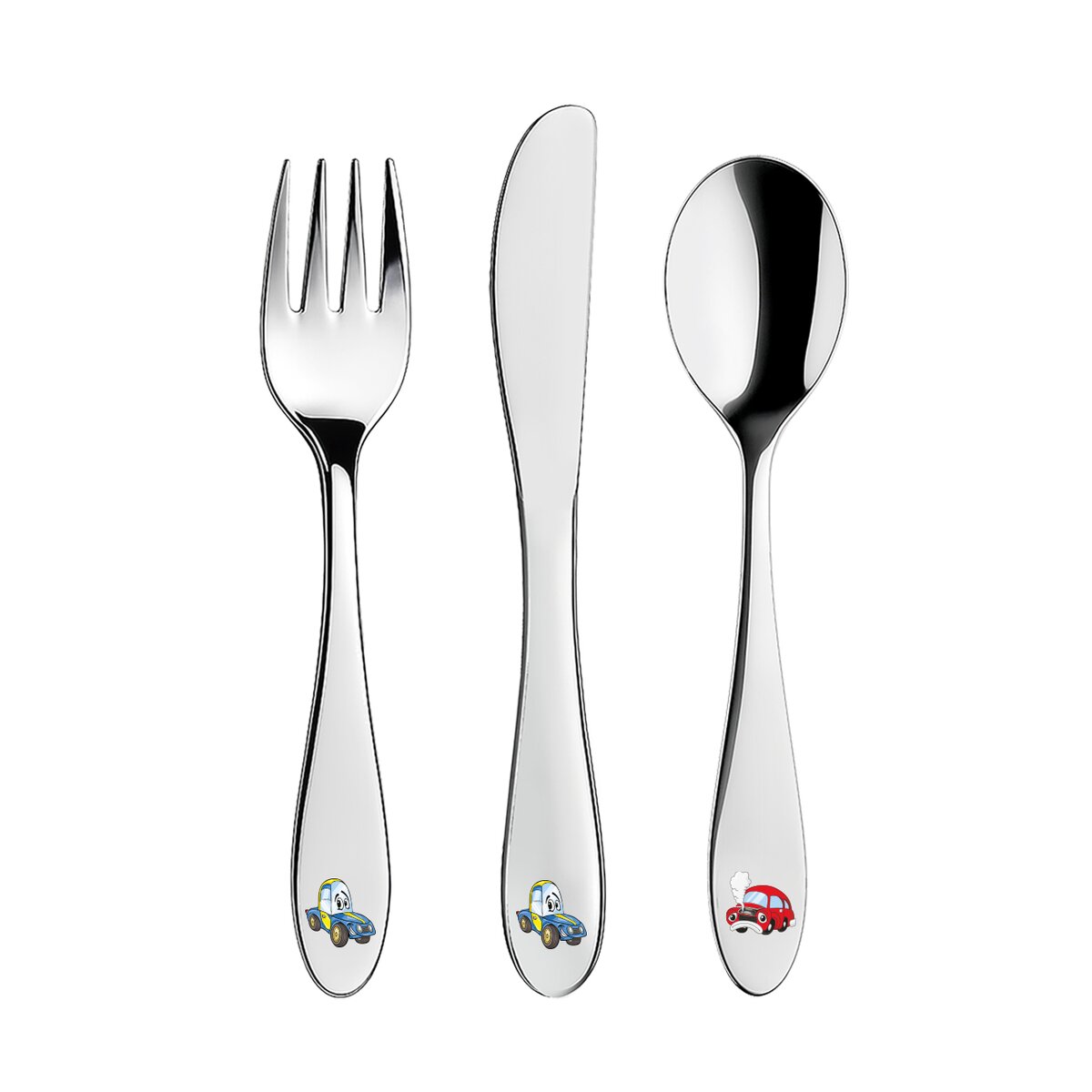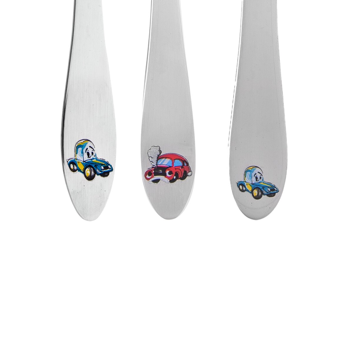 Set dětských nerezových příborů s barevným motivem autíček obsahuje lžíci, vidličku a nůž a je určen pro každodenní používání.