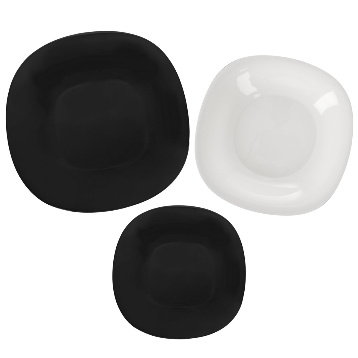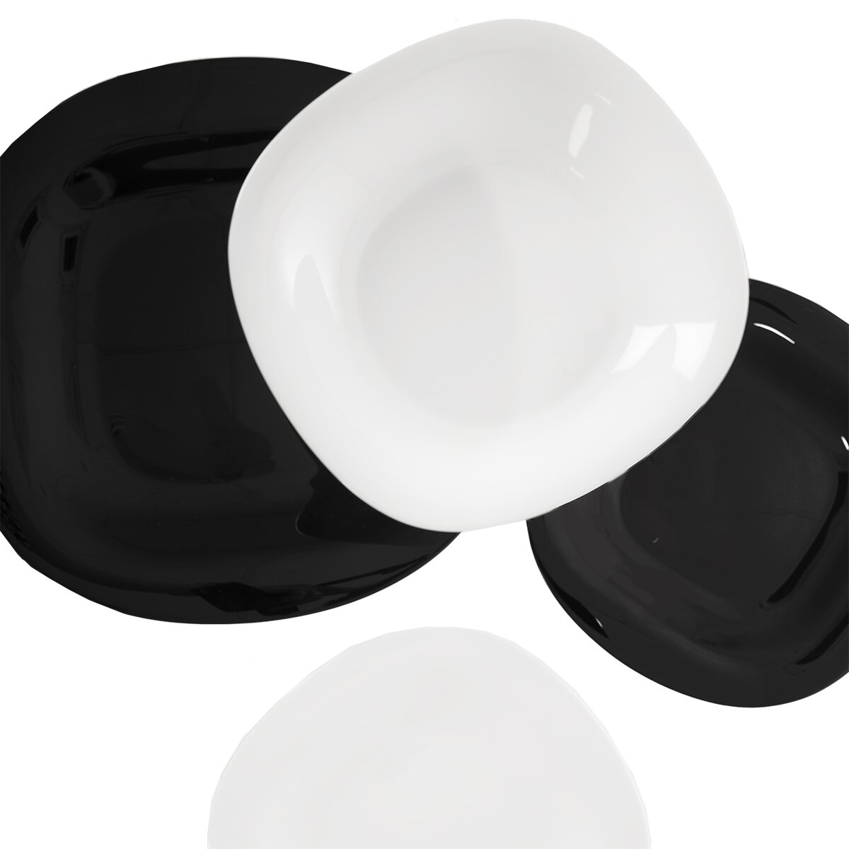 Kód produktu 129535Jídelní sada CARINE z tvrzeného skla je tvořena šesti dezertními, šesti hlubokými a šesti mělkými talíři hranatého tvaru a kombinuje bílou a černou barvu.