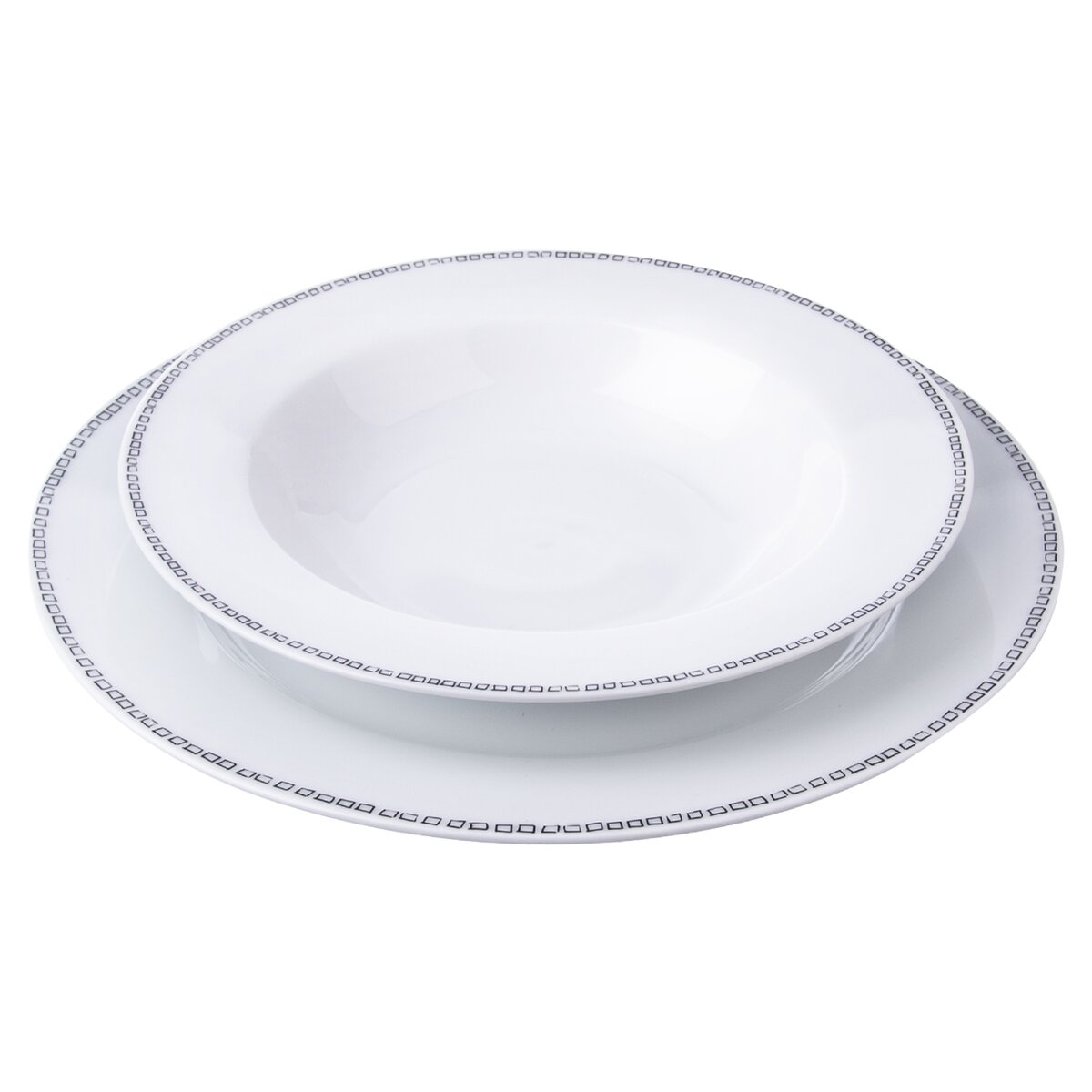 Kód produktu 128455Jídelní porcelánová sada je tvořená šesti dezertními, šesti hlubokými a šesti mělkými talíři s jemným dekorem čtverečků po obvodu.