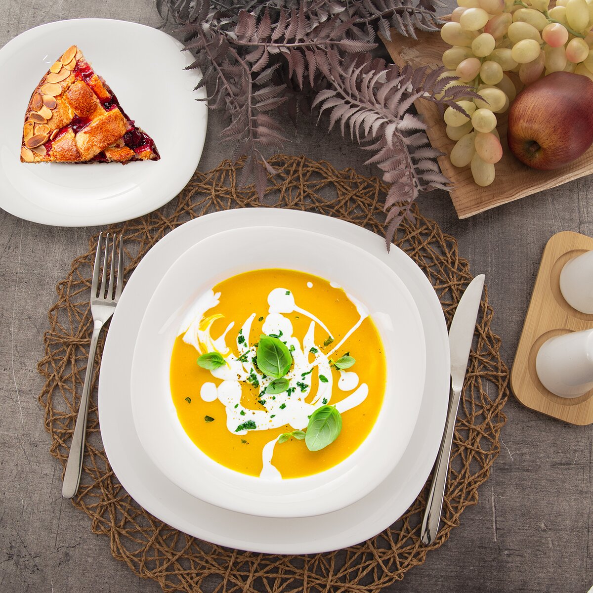 Efektní foodstyling vynikne i díky hranatému, zaoblenému tvaru talířů.