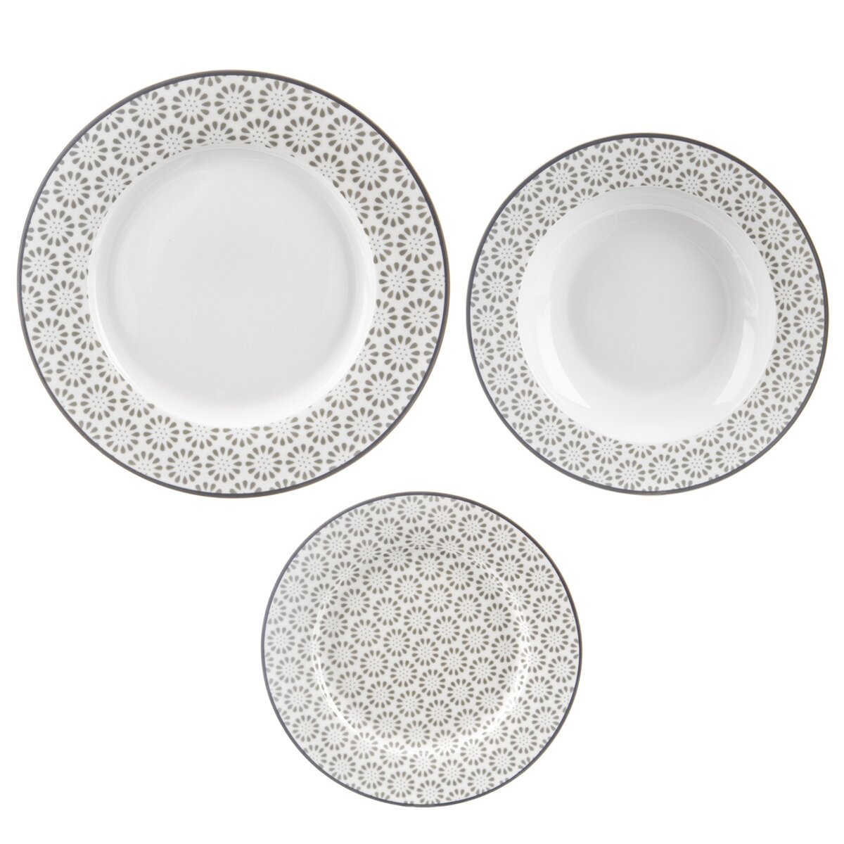 Kód produktu 112356Jídelní porcelánová sada se skládá z 6 kulatých dezertních, 6 mělkých a 6 hlubokých talířů s jemným dekorem, připomínajícím květy.