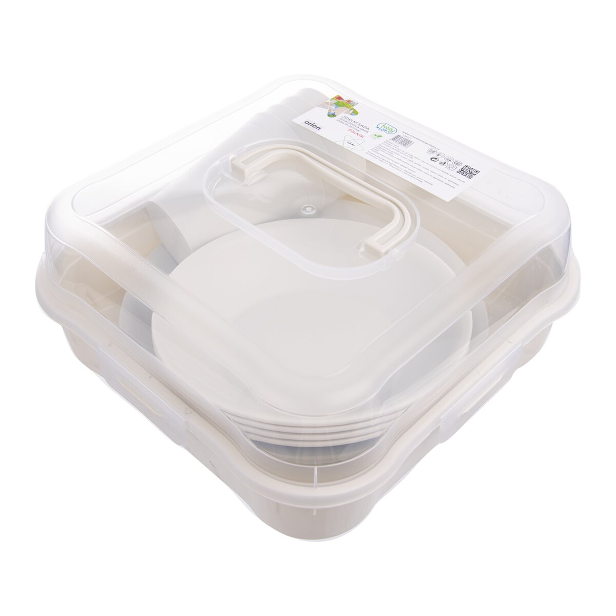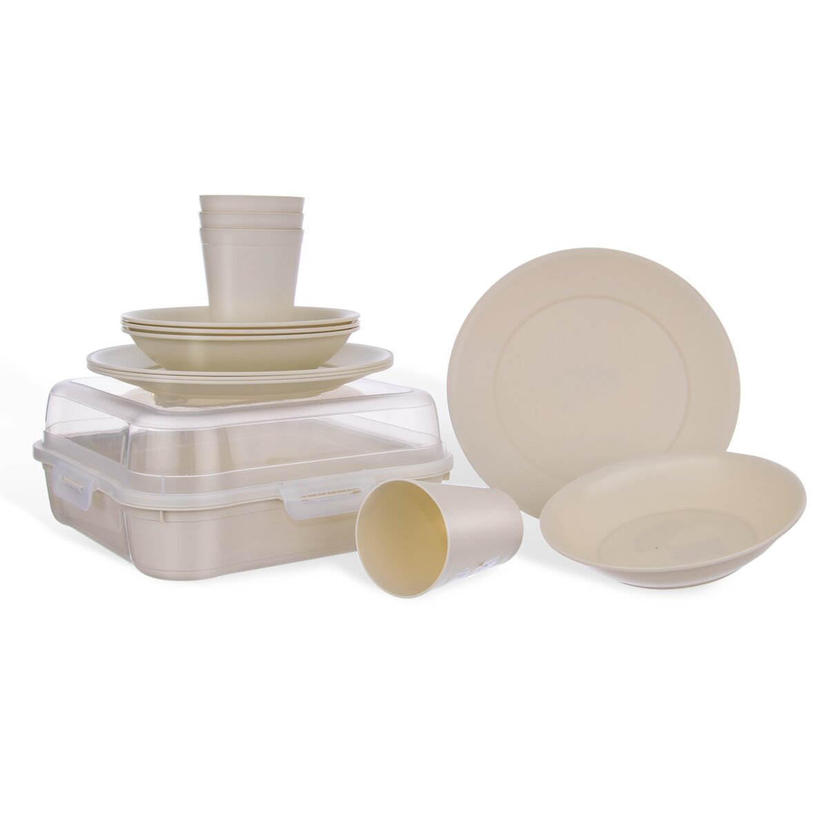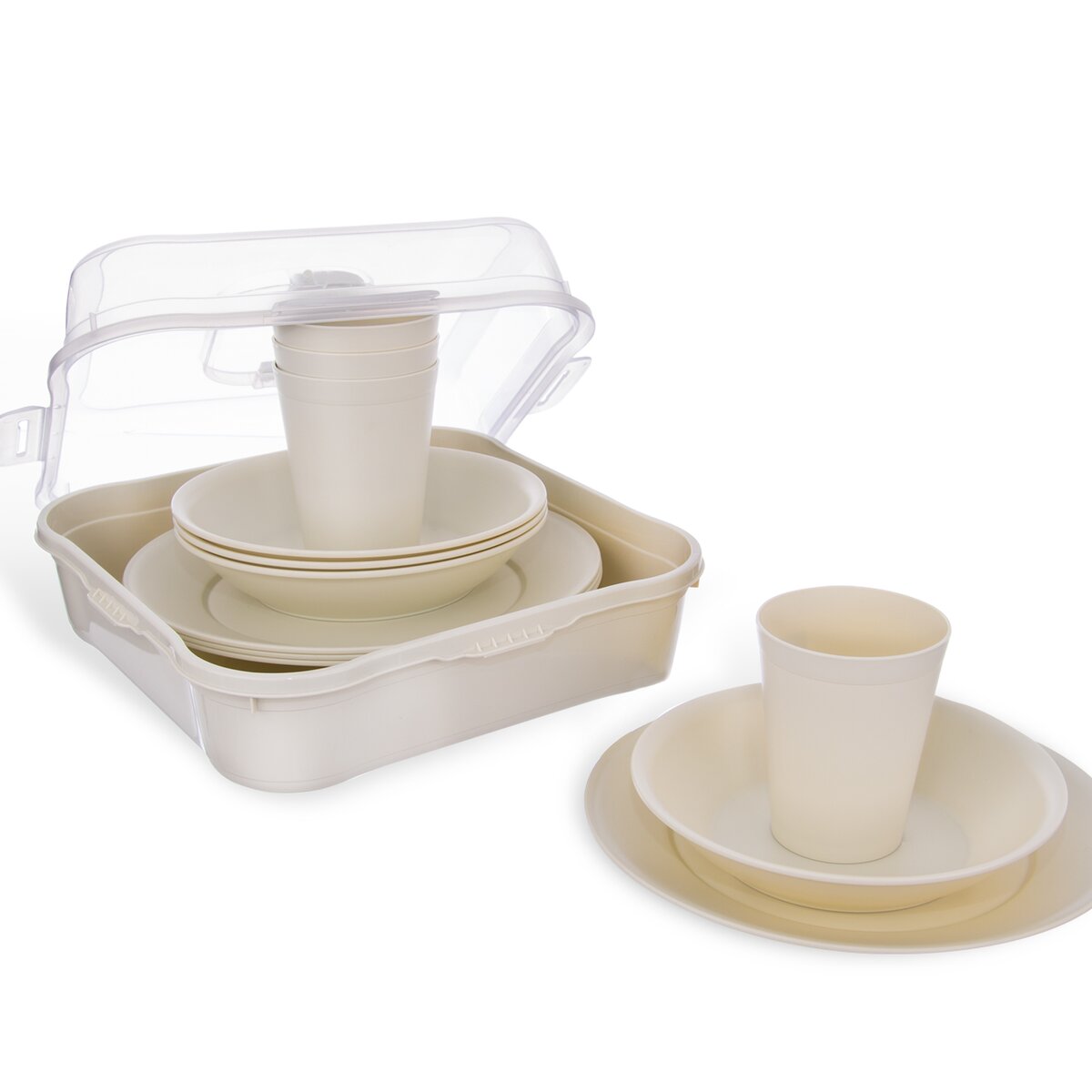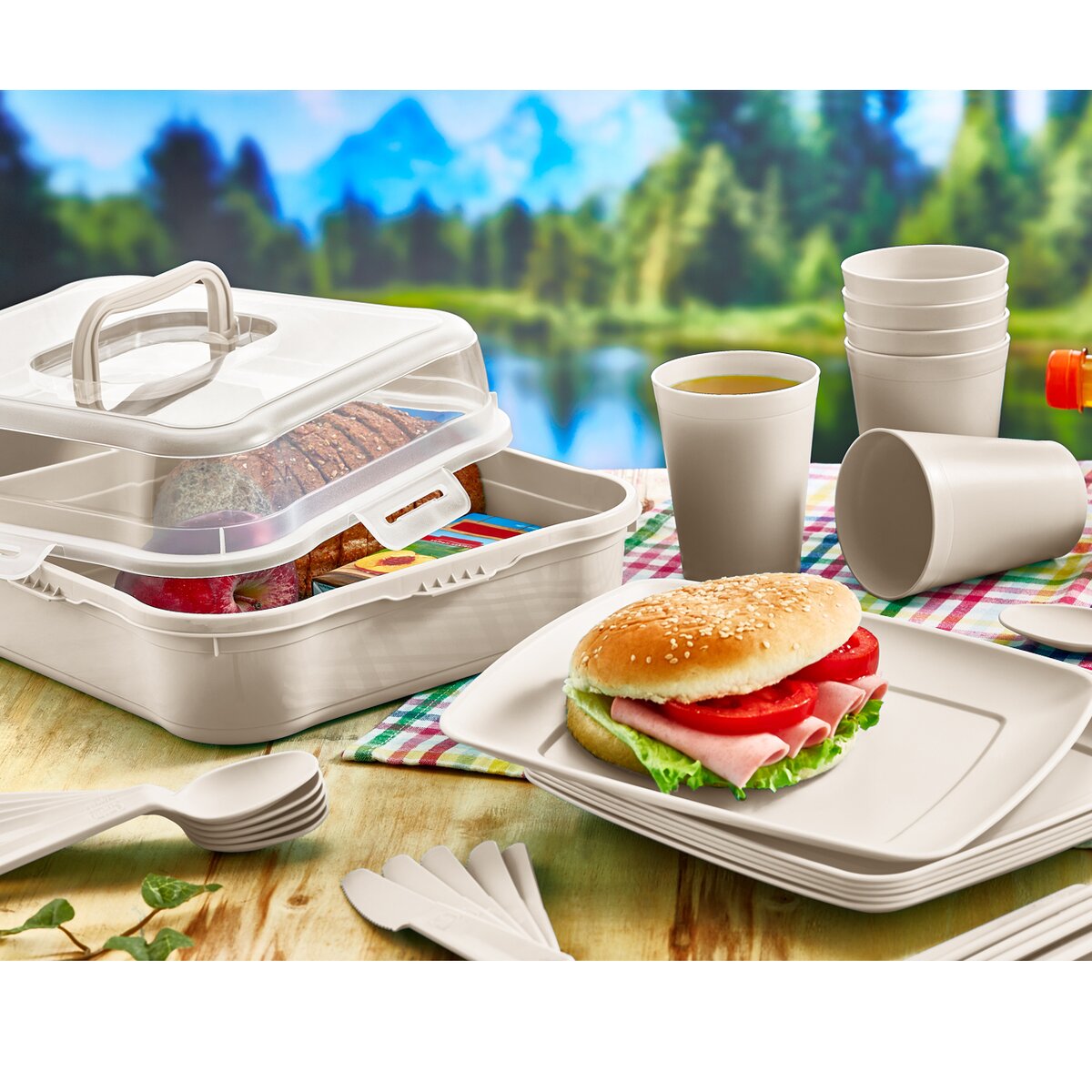 Kód produktu 12837113-dílná plastová jídelní sada na piknik obsahuje 4 mělké a 4 hluboké talíře, 4 poháry a čtvercový box s víkem s uzavíráním na pevné klipy.