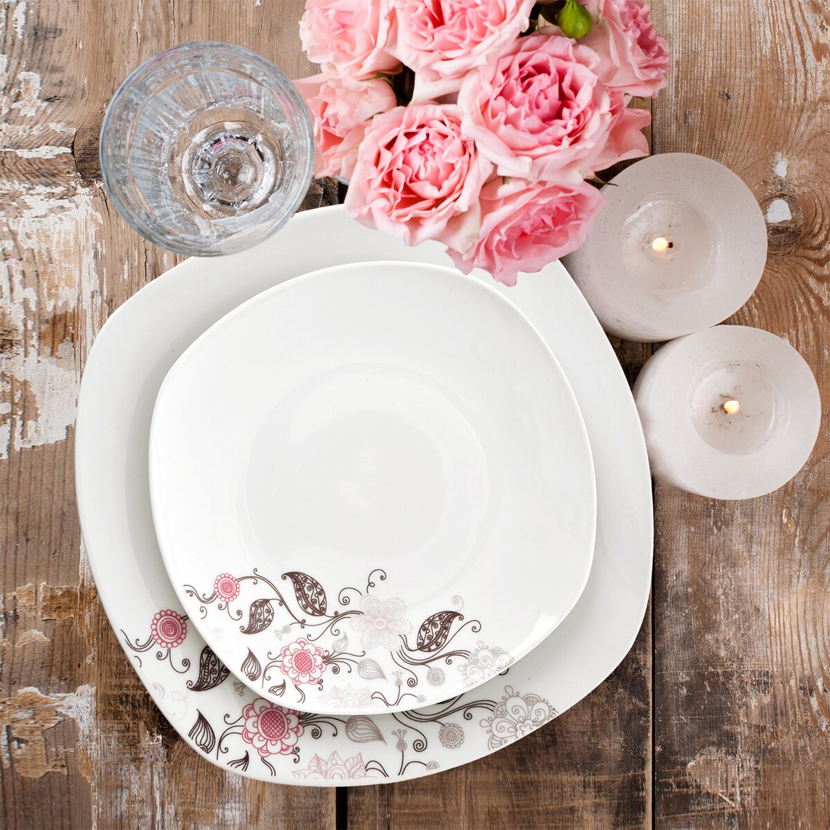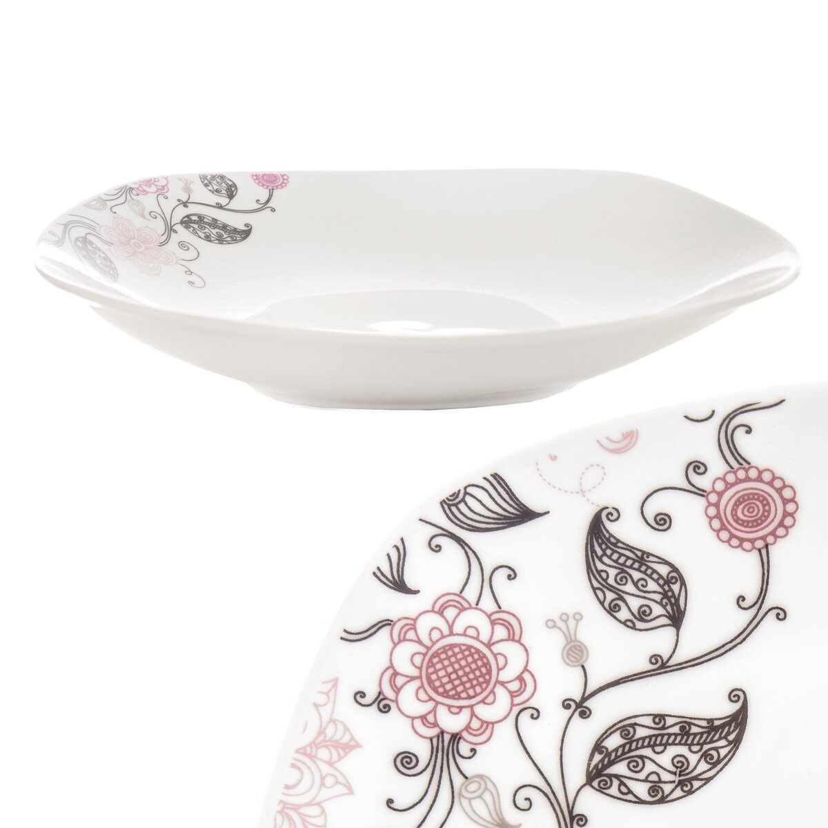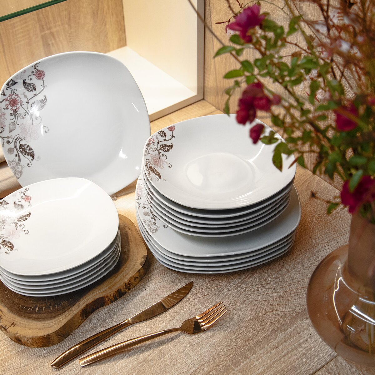 Kód produktu 112358Jídelní porcelánová sada se skládá z 6 hranatých dezertních, 6 mělkých a 6 hlubokých talířů s jemným květinovým dekorem.