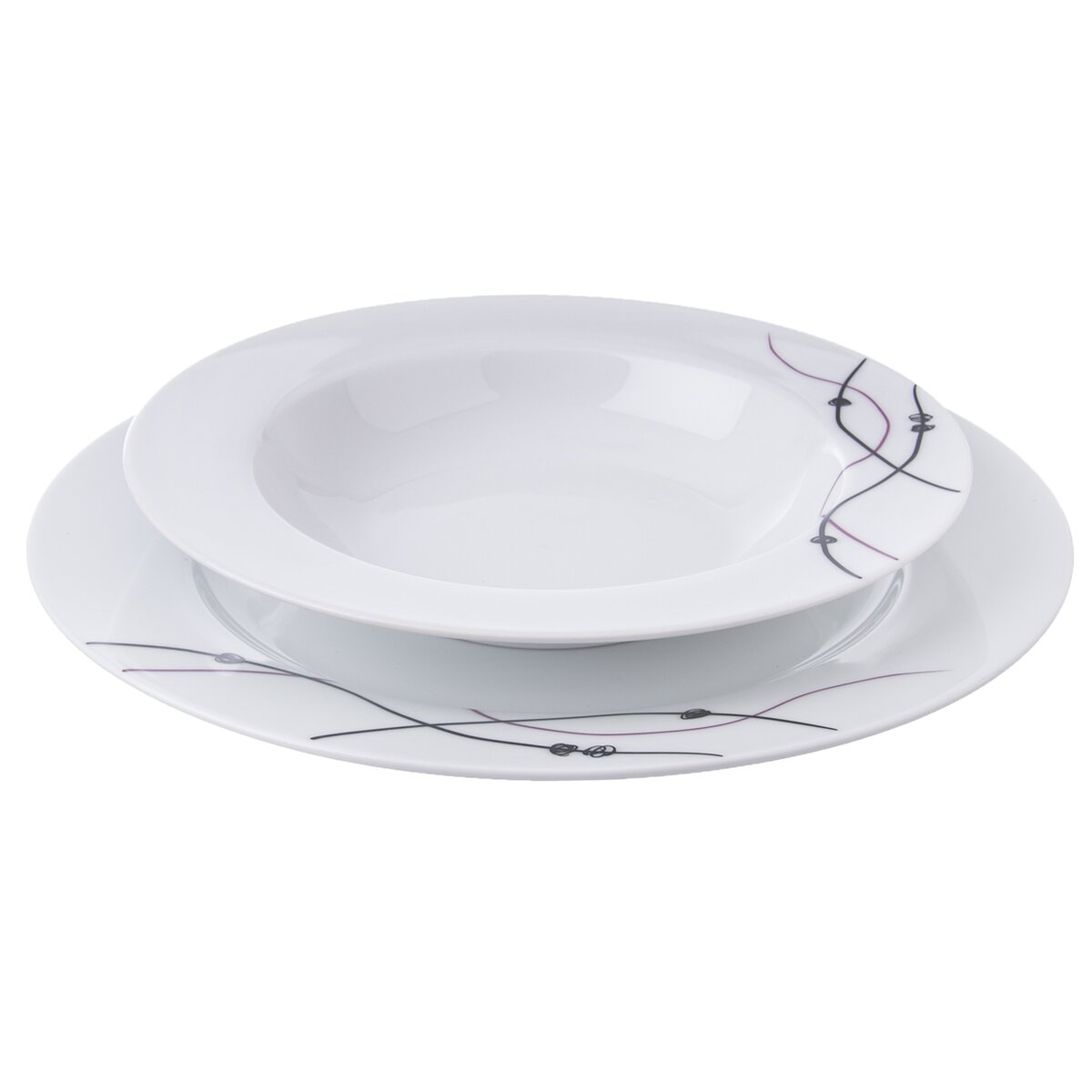 Kód produktu 128454Jídelní porcelánová sada je tvořená šesti dezertními, šesti hlubokými a šesti mělkými talíři s jemným dekorem vlnek.
