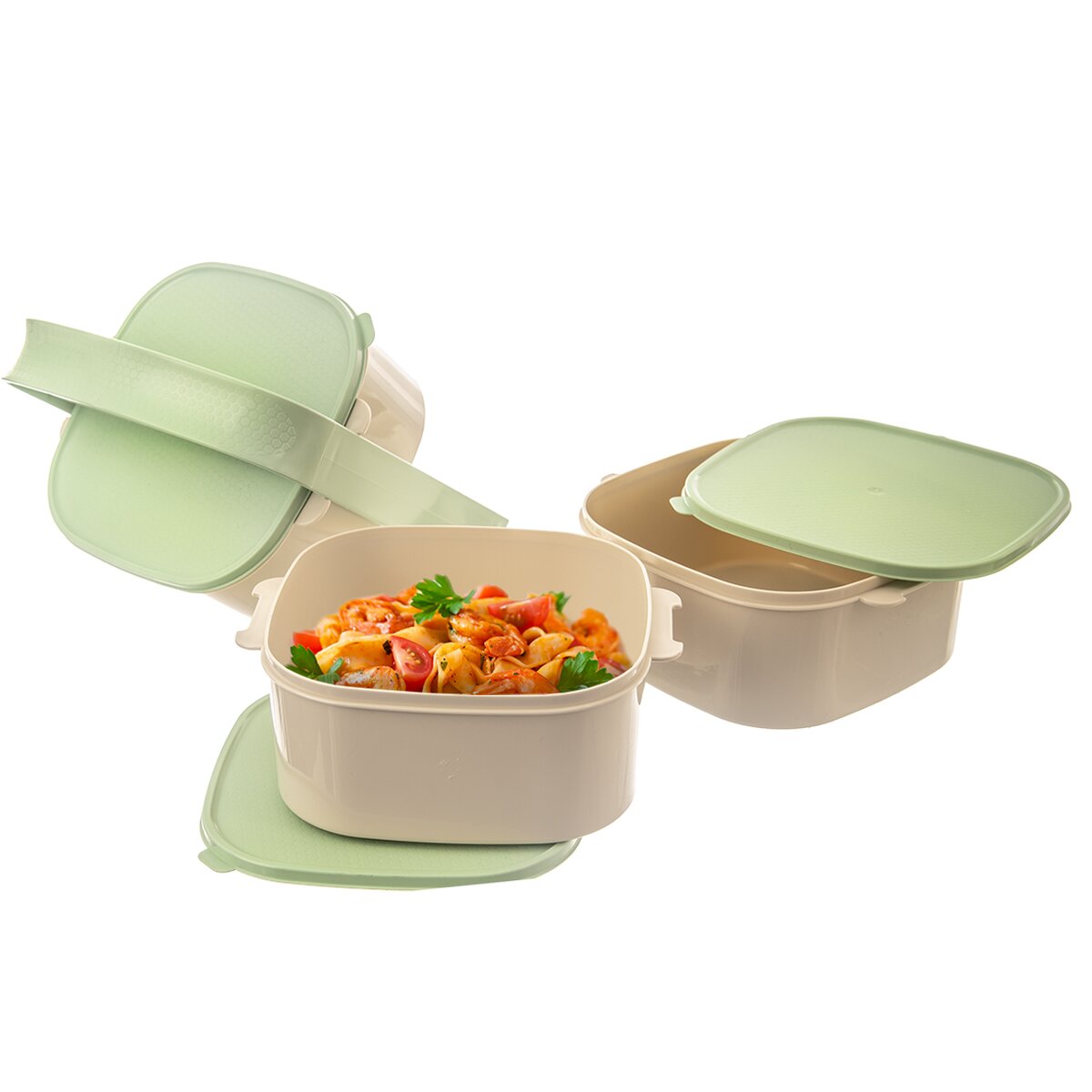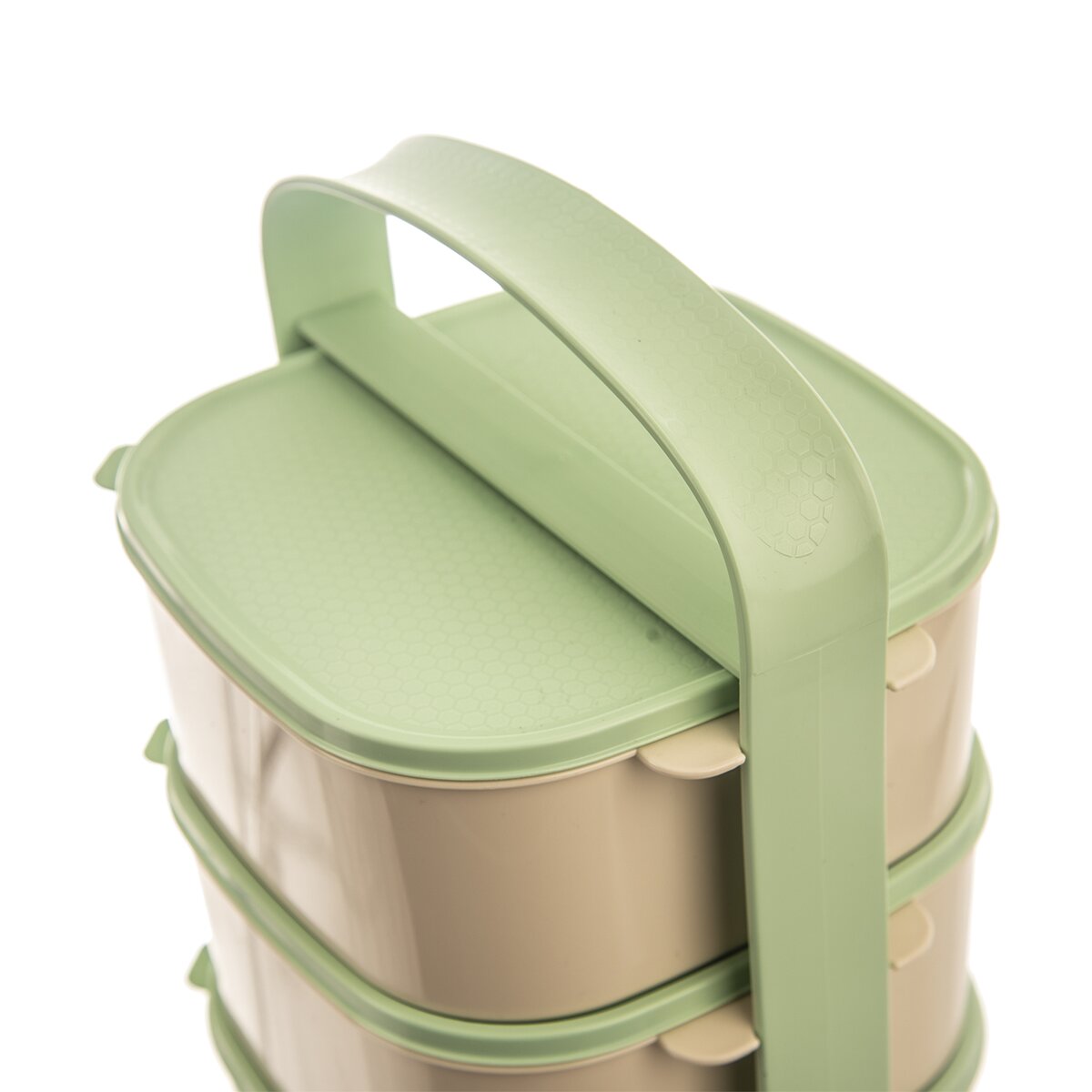 Kód produktu 120960Zeleno-béžový třípatrový jídlonosič ALMI o objemu 3×1,15 l. Obsahuje 3 hranaté misky z kvalitního plastu, z nichž je každá opatřena vlastním víčkem.