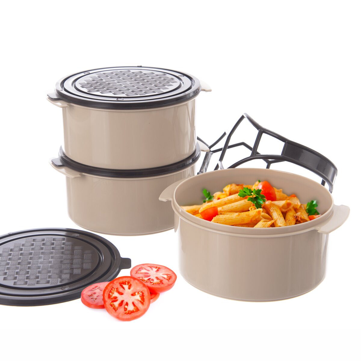 Tvoří jej tři kulaté misky, z nichž každá má objem 1,5 l a je opatřena vlastním víčkem. Nádoby se na sebe upevňují pomocí spony, která zároveň vytváří praktické držadlo k přenášení.