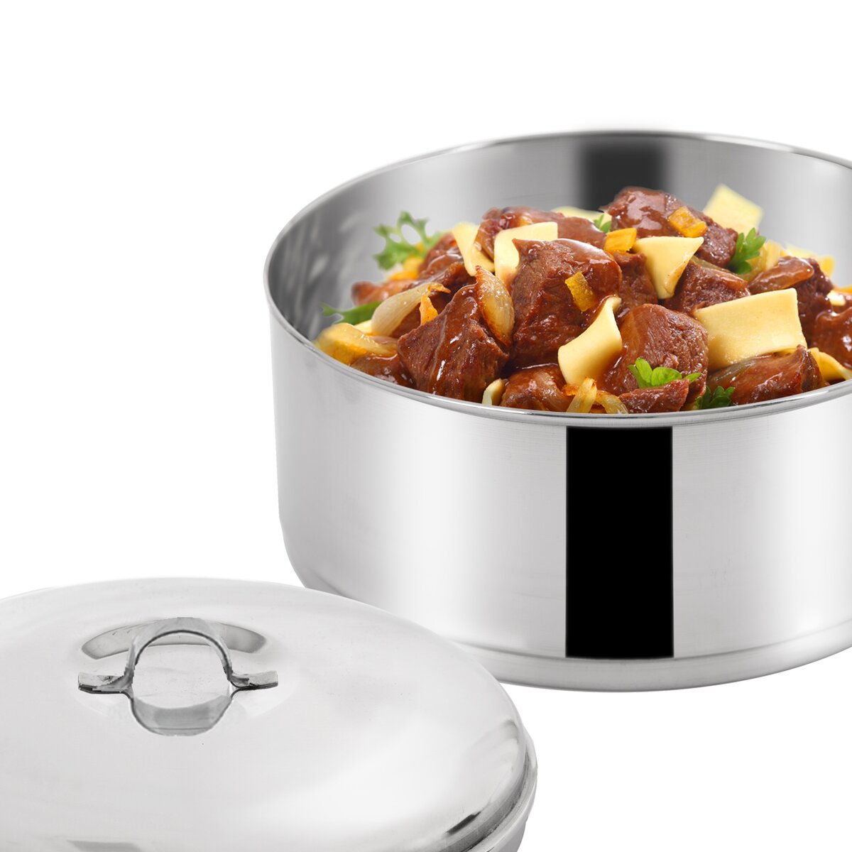 Obsahuje 3 nerezové misky o objemu 1 litr, budou ideální pro uložení celého menu, polévky, hlavního jídla a salátu nebo dezertu. Jeho součástí je také kovový stojan, který umožňuje skládání nádob na sebe a zároveň je opatřený přezkou sloužící k jejich pevnému zajištění.