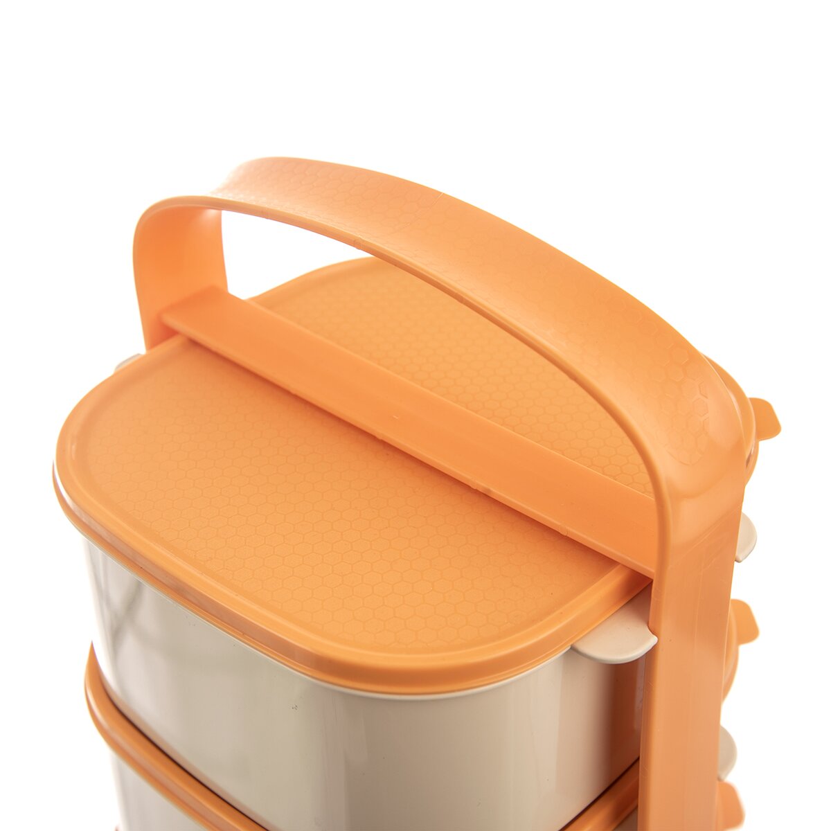 Kód produktu 120961Oranžovo-béžový čtyřpatrový jídlonosič ALMI o objemu 4×1,15 l. Obsahuje 4 hranaté misky z kvalitního plastu, z nichž je každá opatřena vlastním víčkem.