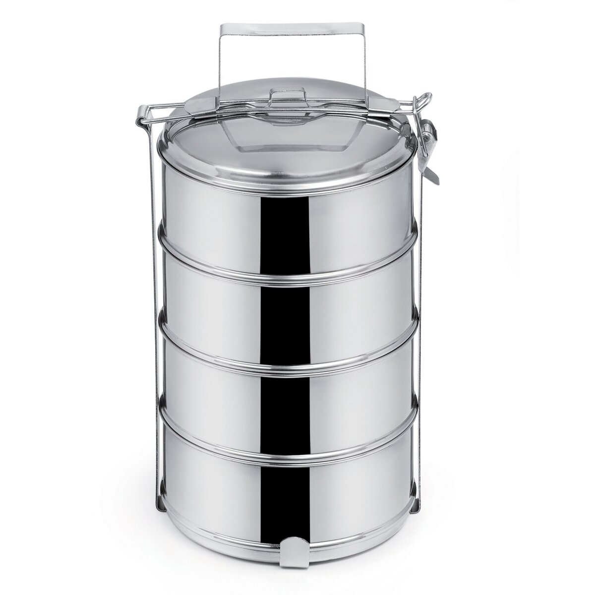Kód produktu 120914Nerezový čtyřpatrový jídlonosič v rovném provedení, jehož součástí jsou 4 misky o objemu 1 l, vrchní poklice a kovový stojan s přezkou a uchem, který sestavu spojí a umožní jeho přenášení.