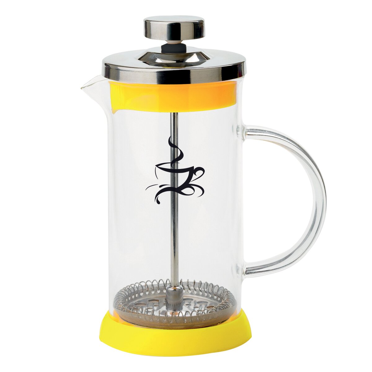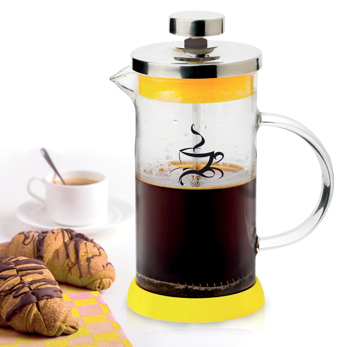Konvice se sítkem snadno a rychle připraví kávu bez lógru nebo sypaný čaj bez lístků či květů. Pomocí jemného sítka stlačíte pevné částečky z nápoje na dno konvice. Je ale také skvělá pro přípravu ledové kávy s hustou pěnou (pouze voda, instantní káva, popřípadě cukr nebo med a napěníte). Výborně napění teplé mléko do kávy nebo dětské kakao či caro. Snadná manipulace, jednoduché čištění, díky silikonu neklouže po podložce. Materiál: sklo (odolné teplotám do 180 °C, ale není varné sklo!), plast, silikon, nerez. Barva žlutá. Rozměry: objem 0,8 l, pr. 9,5 cm, v.18 cm.