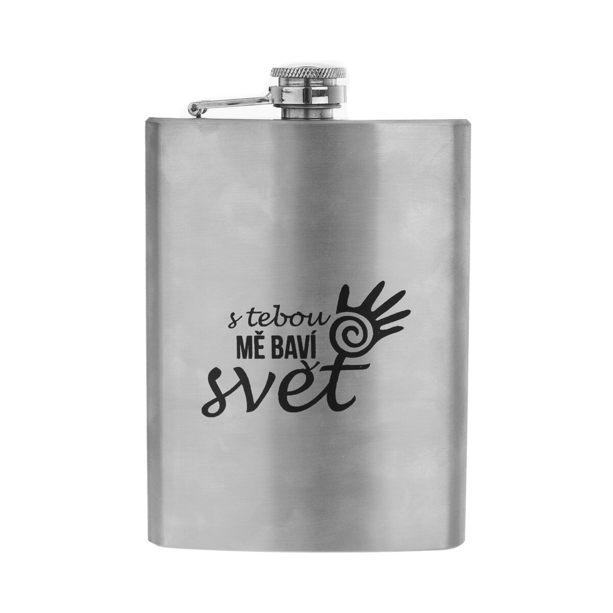 Kód produktu 124585Nerezová kapesní placatka o objemu 0,24 l s dekorem S TEBOU MĚ BAVÍ SVĚT.
