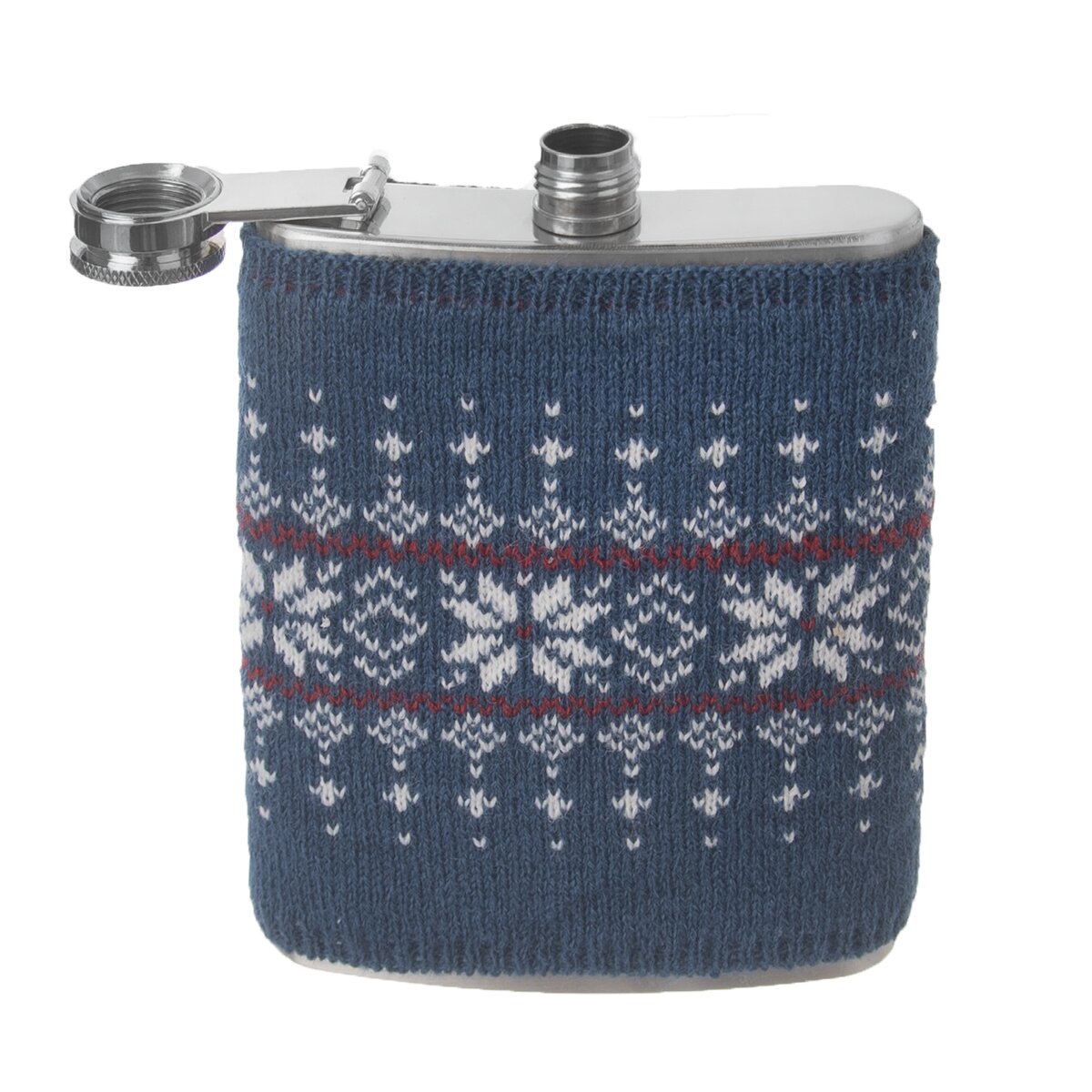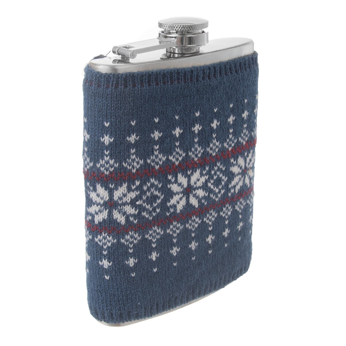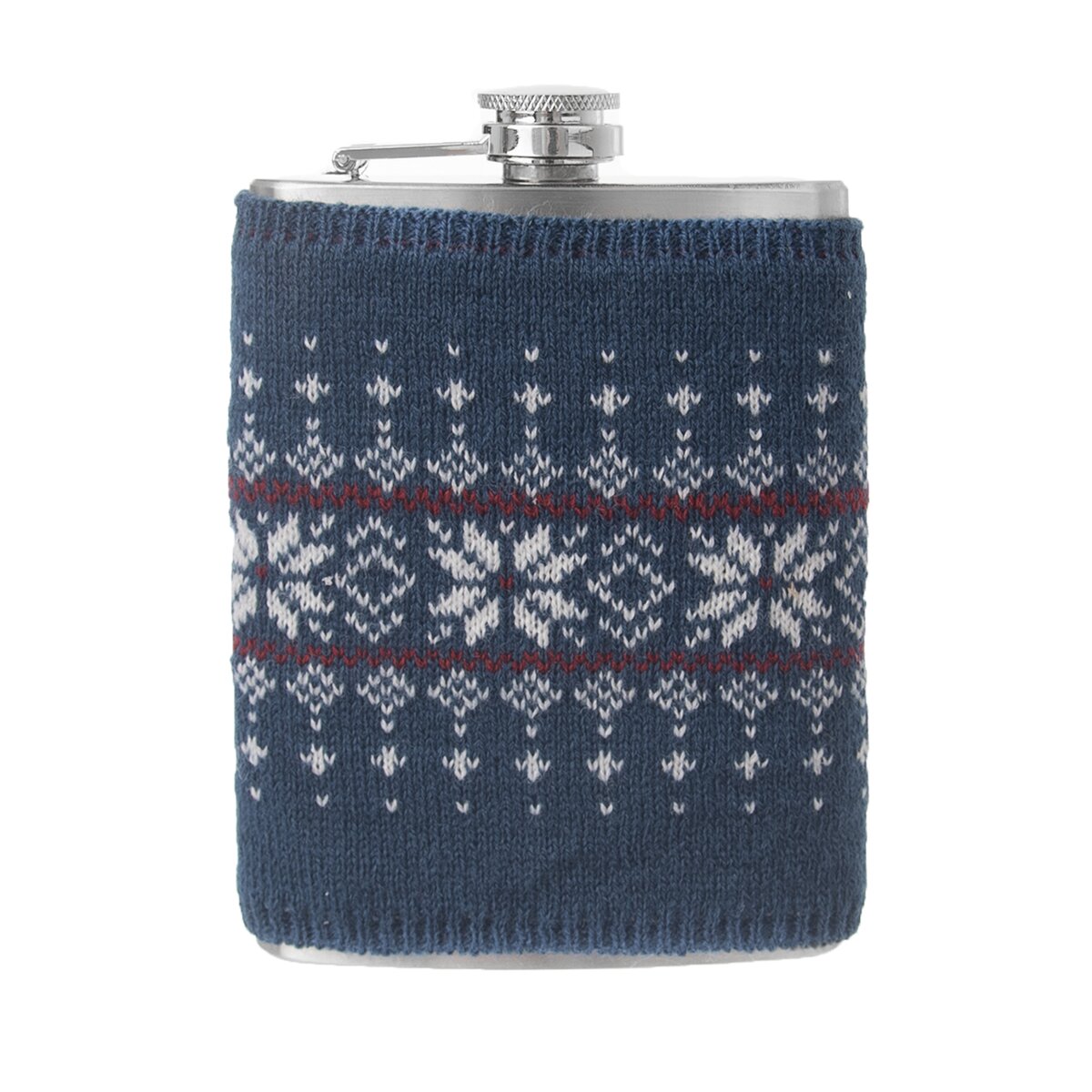 Kapesní lahvička na alkohol – placatka doplněná o pletený svetr se vzorem. Materiál: nerez, akryl. Rozměry: objem 0,24 l, 9,5x2,5x13,5 cm, svetr 10x11 cm.