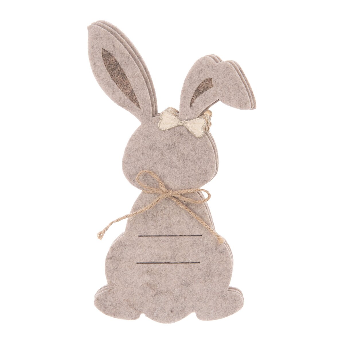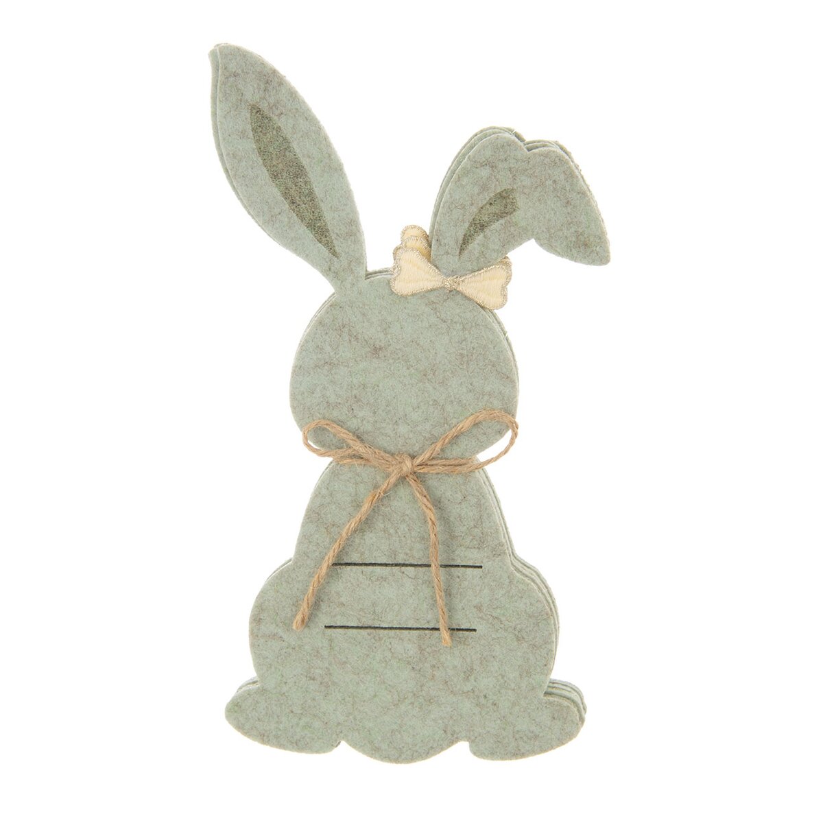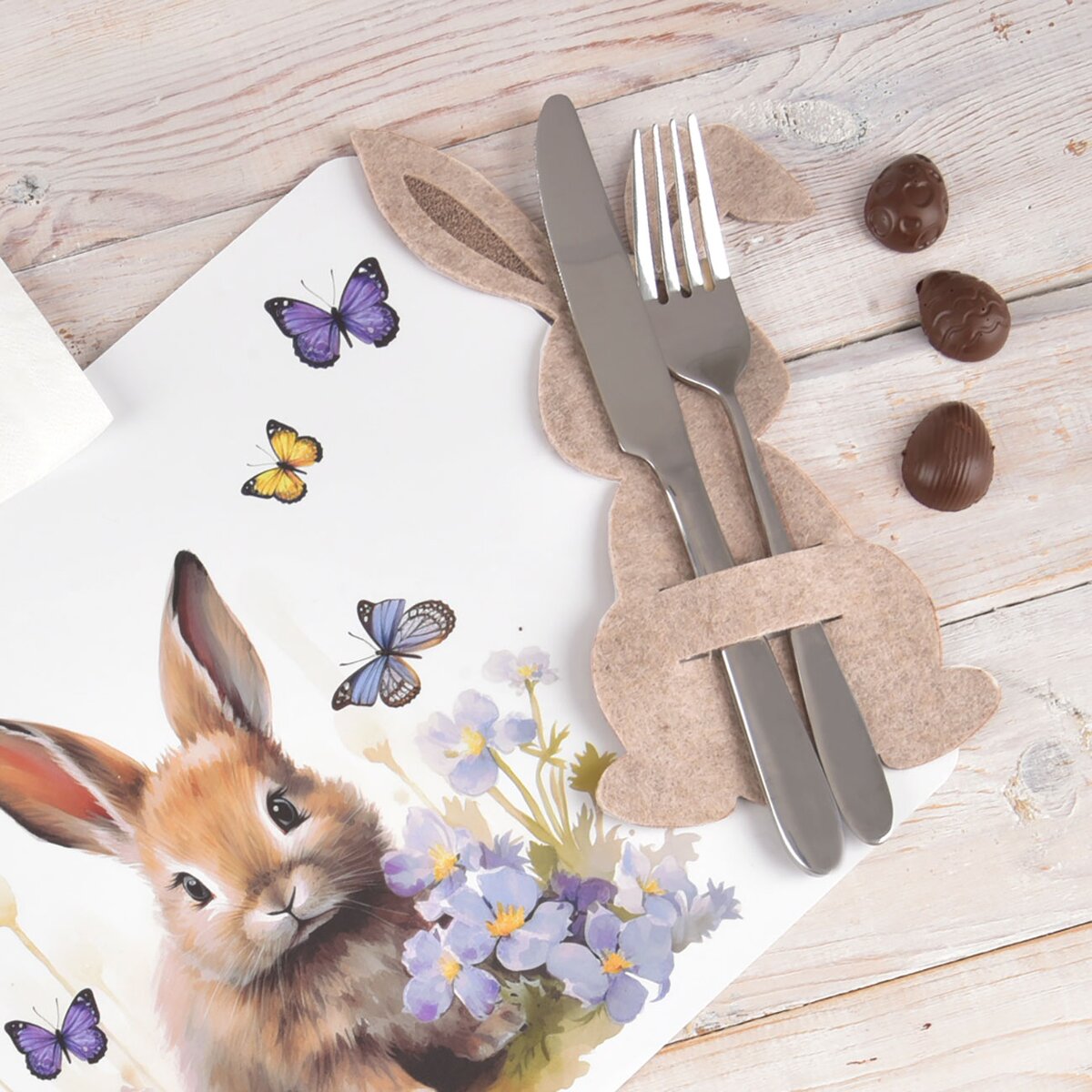 Kód produktu 728079Sada 4 kusů filcových kapes v příjemném tlumeném odstínu ozdobí prostřený stůl především v době Velikonoc. Tvar zajíčka a 2 proseknuté otvory umožní jednoduché vložení příborů.