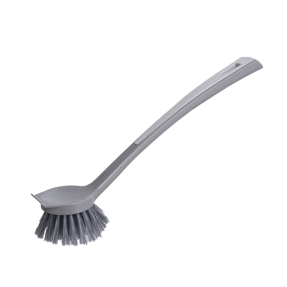 Nechcete si při mytí nádobí namáčet ruce ve špinavé vodě? Vyměňte hadry či houbičky na nádobí za tento plastový kartáč s rukojetí. Je zakončen rovnou plochou, kterou lze použít na připečené části plechů a kastrolů, které je po odmočení třeba stáhnout.